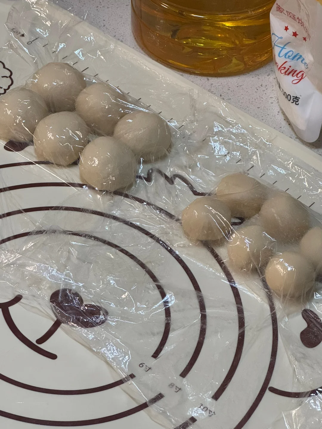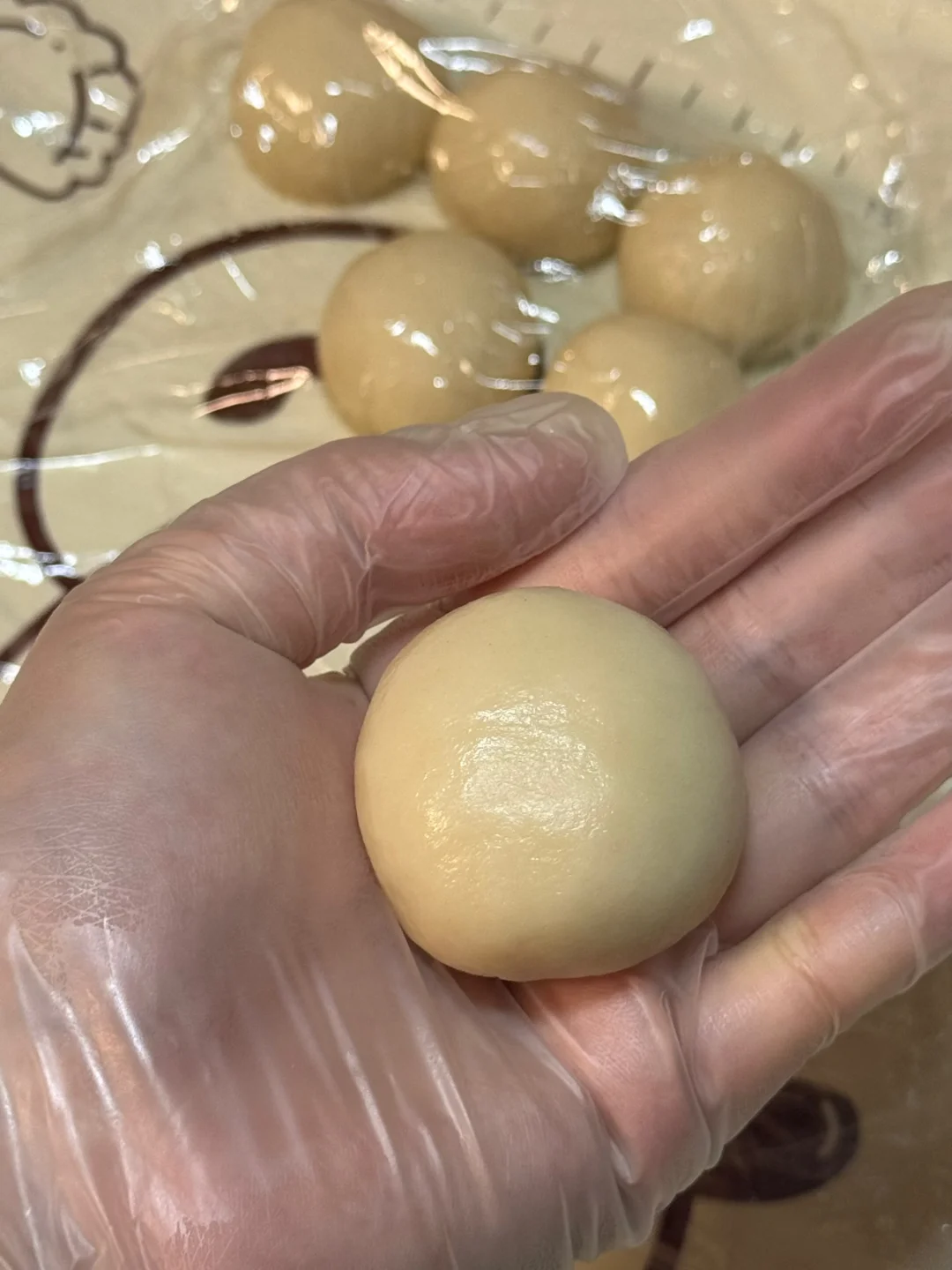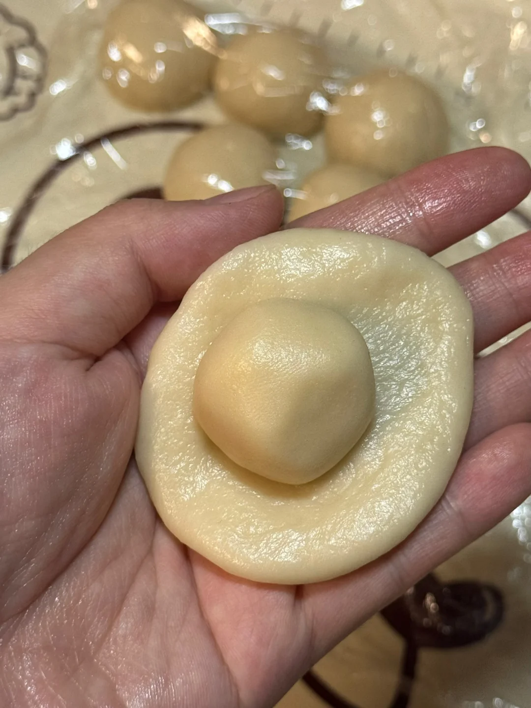 4.用的生咸蛋黄,一定要使用常温的,用25g豆沙包裹每颗咸蛋黄备用。