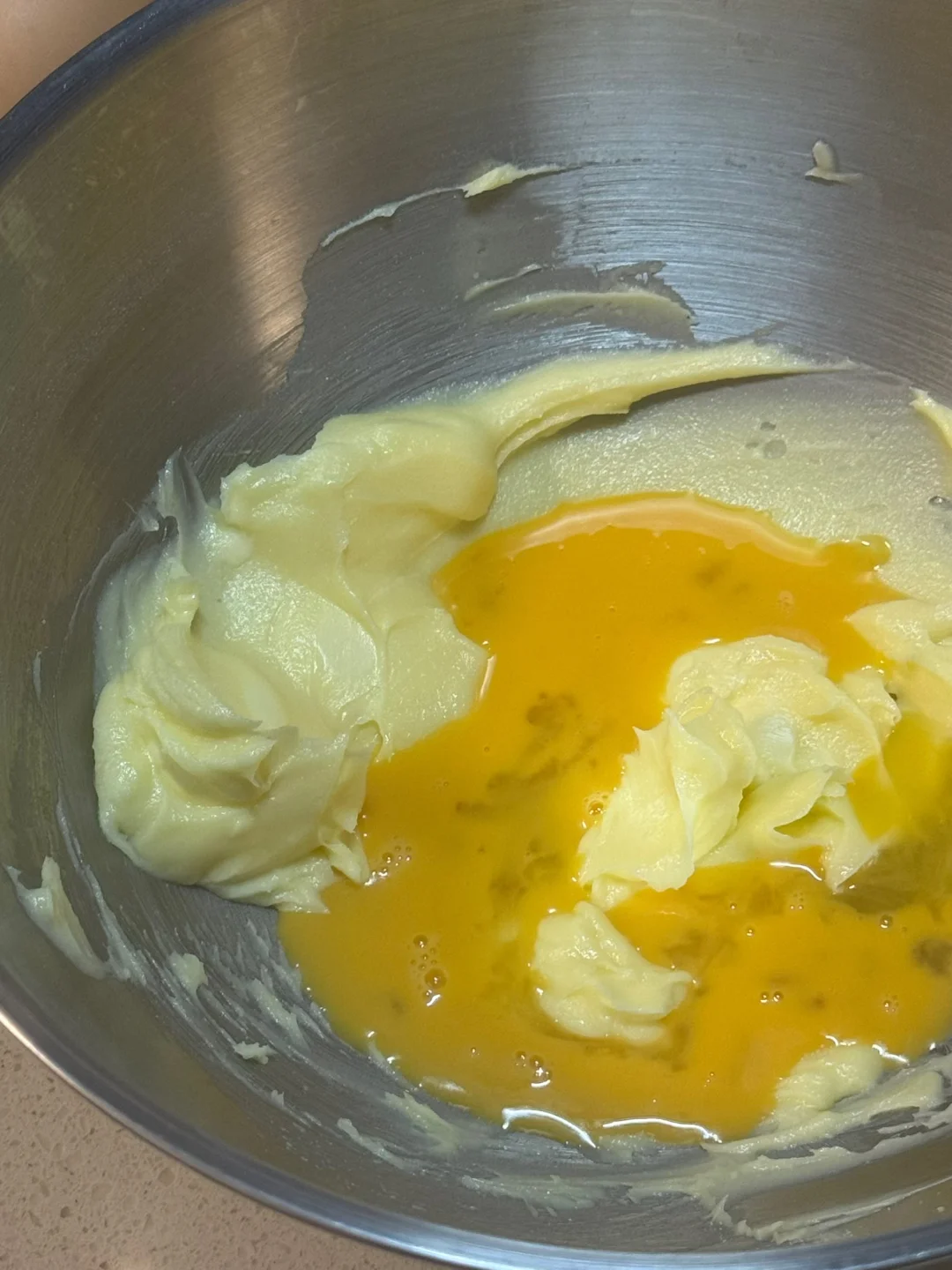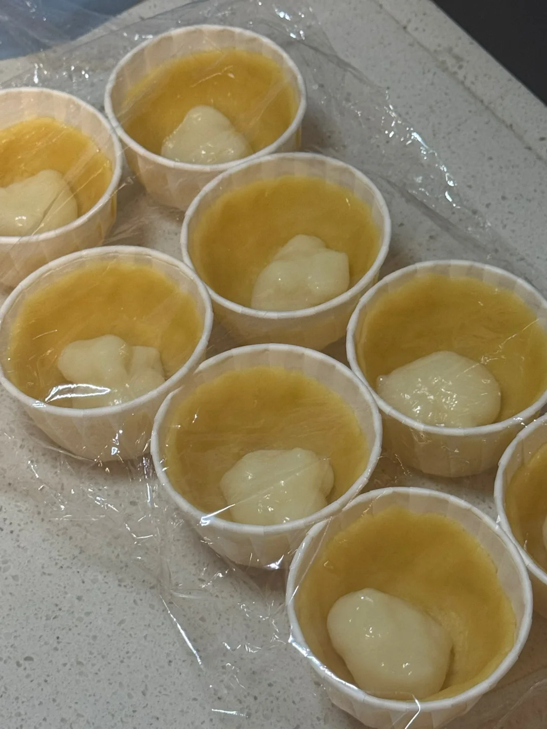 黄油软化后,加入糖粉翻拌均匀,分次加入蛋液打发均匀,筛入低粉,拌均匀再下手揉成团,均分成8份揉圆,放入纸杯,先按下去然后慢慢给她往上摊,底部不要太厚,容易没熟,将麻薯依次放入纸杯中,按压一下让他们粘住。