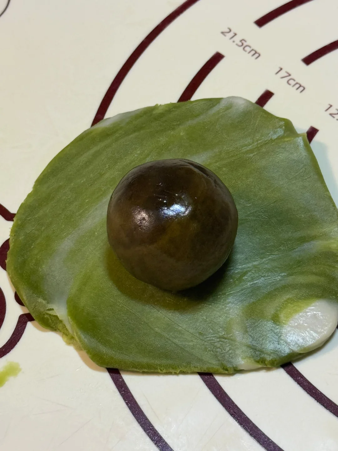 2.取一个面团,用手指在中间压一下,两端往中间压,擀扁擀开后包入馅料,虎口收紧,接口处捏紧。