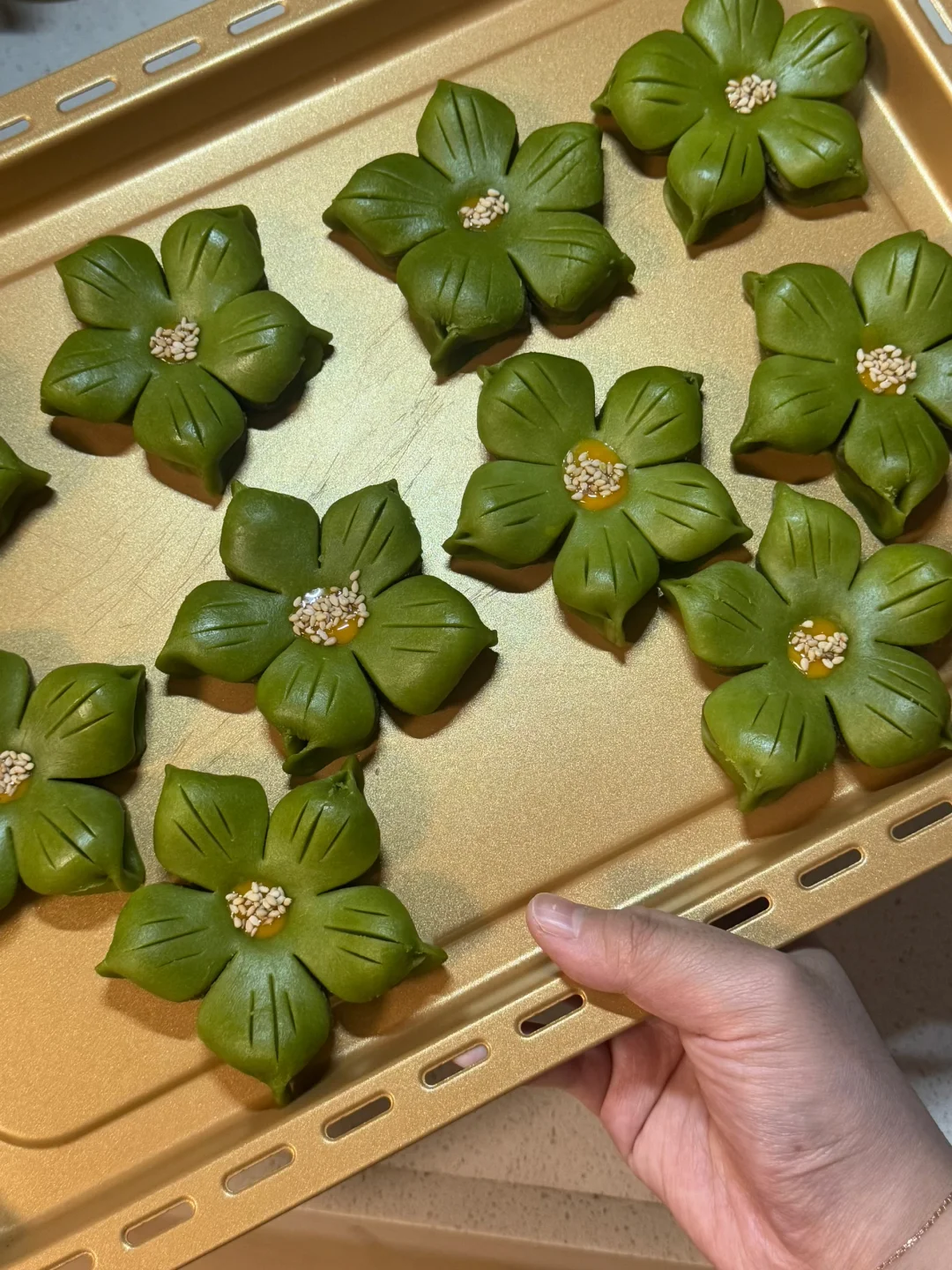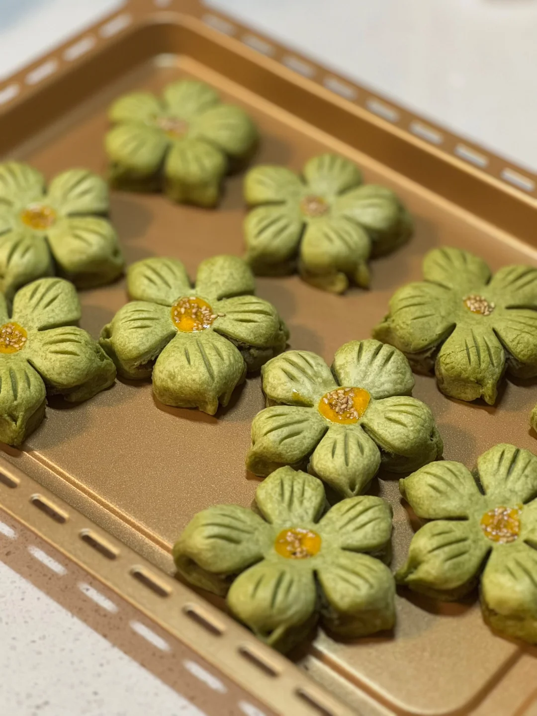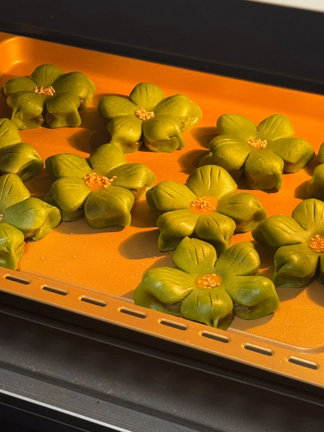 3.取一个面团用刮刀压扁,在中间固定一个小圈,均分割5刀,两端捏出花瓣形状,中间轻割3刀(花蕊),中间放一点蛋黄液,撒上白芝麻。