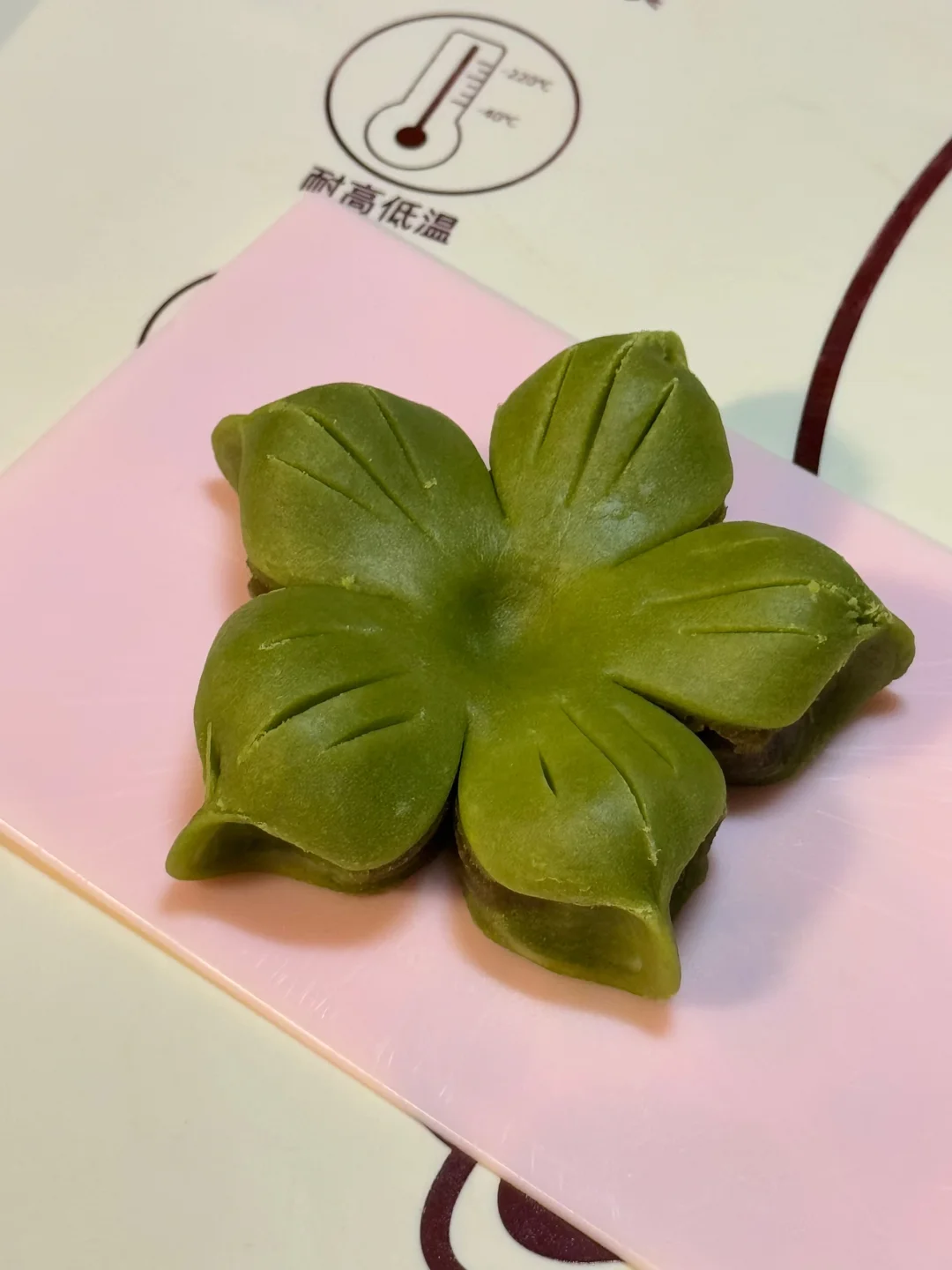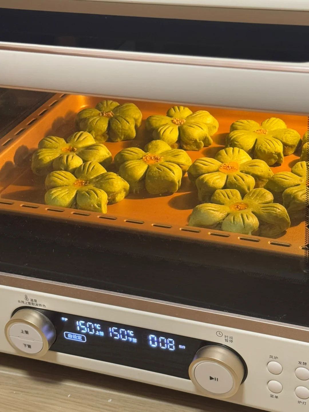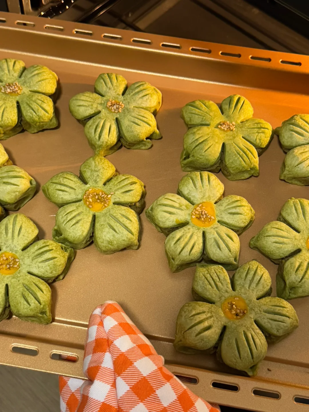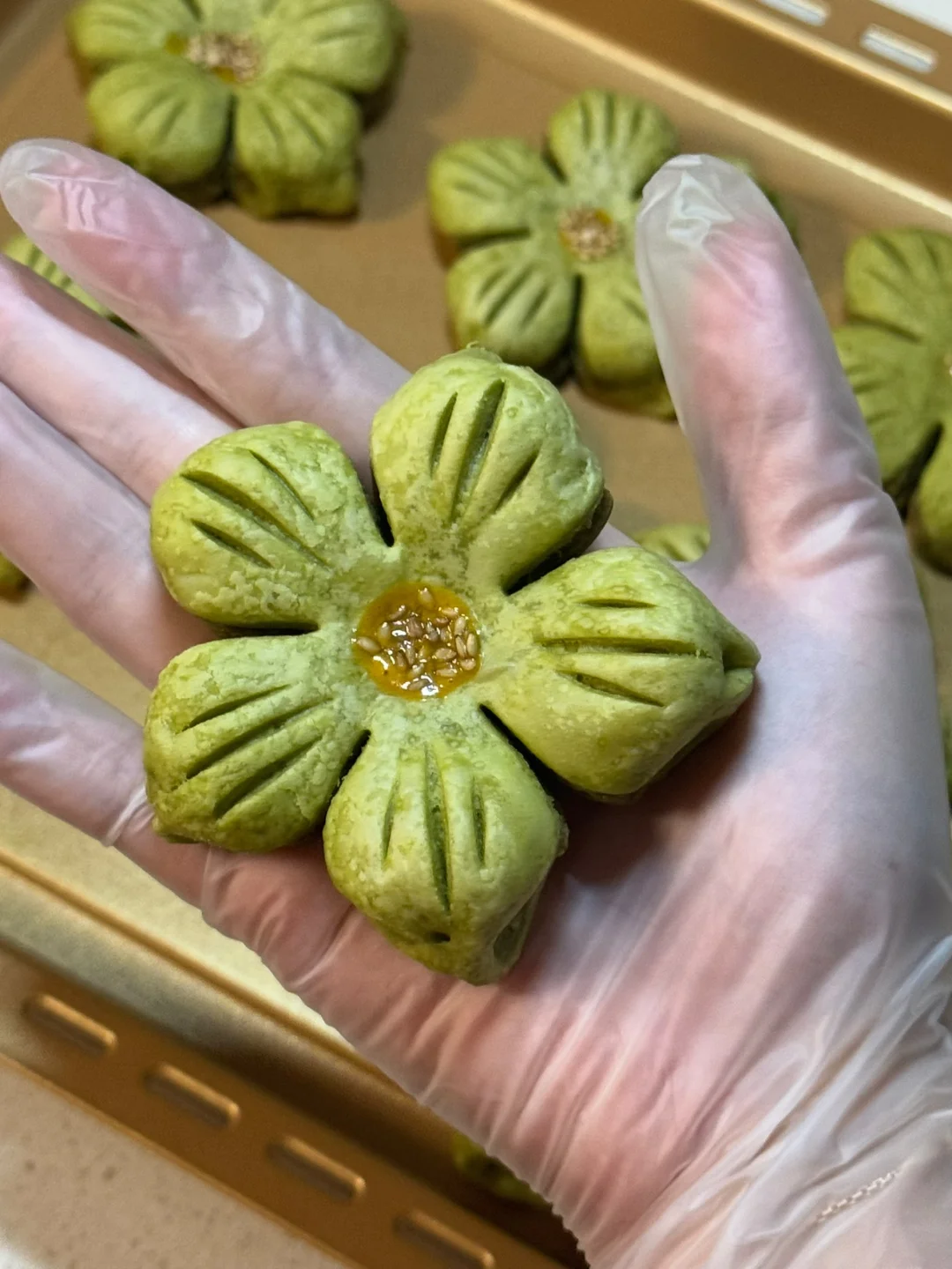 3.取一个面团用刮刀压扁,在中间固定一个小圈,均分割5刀,两端捏出花瓣形状,中间轻割3刀(花蕊),中间放一点蛋黄液,撒上白芝麻。