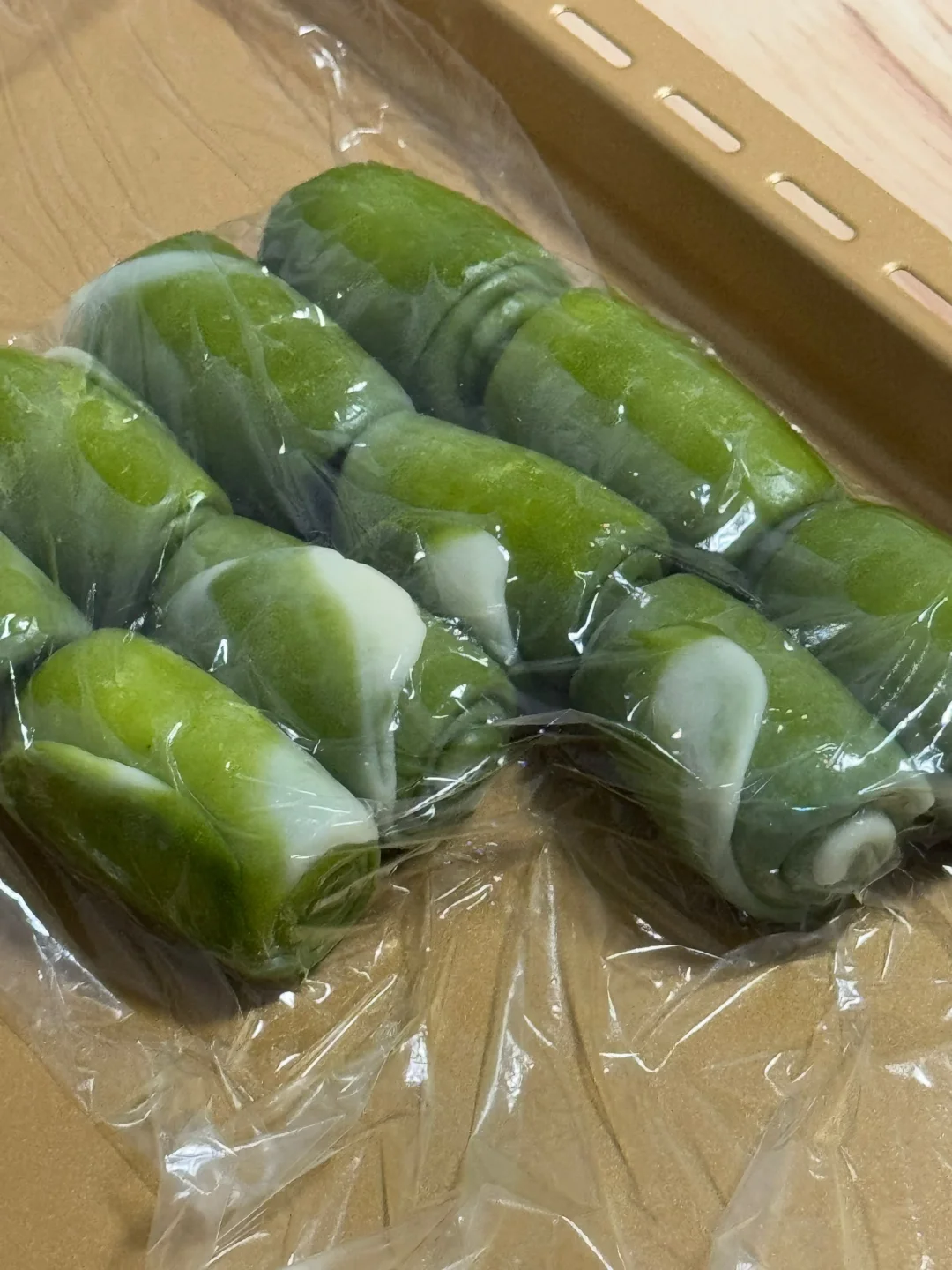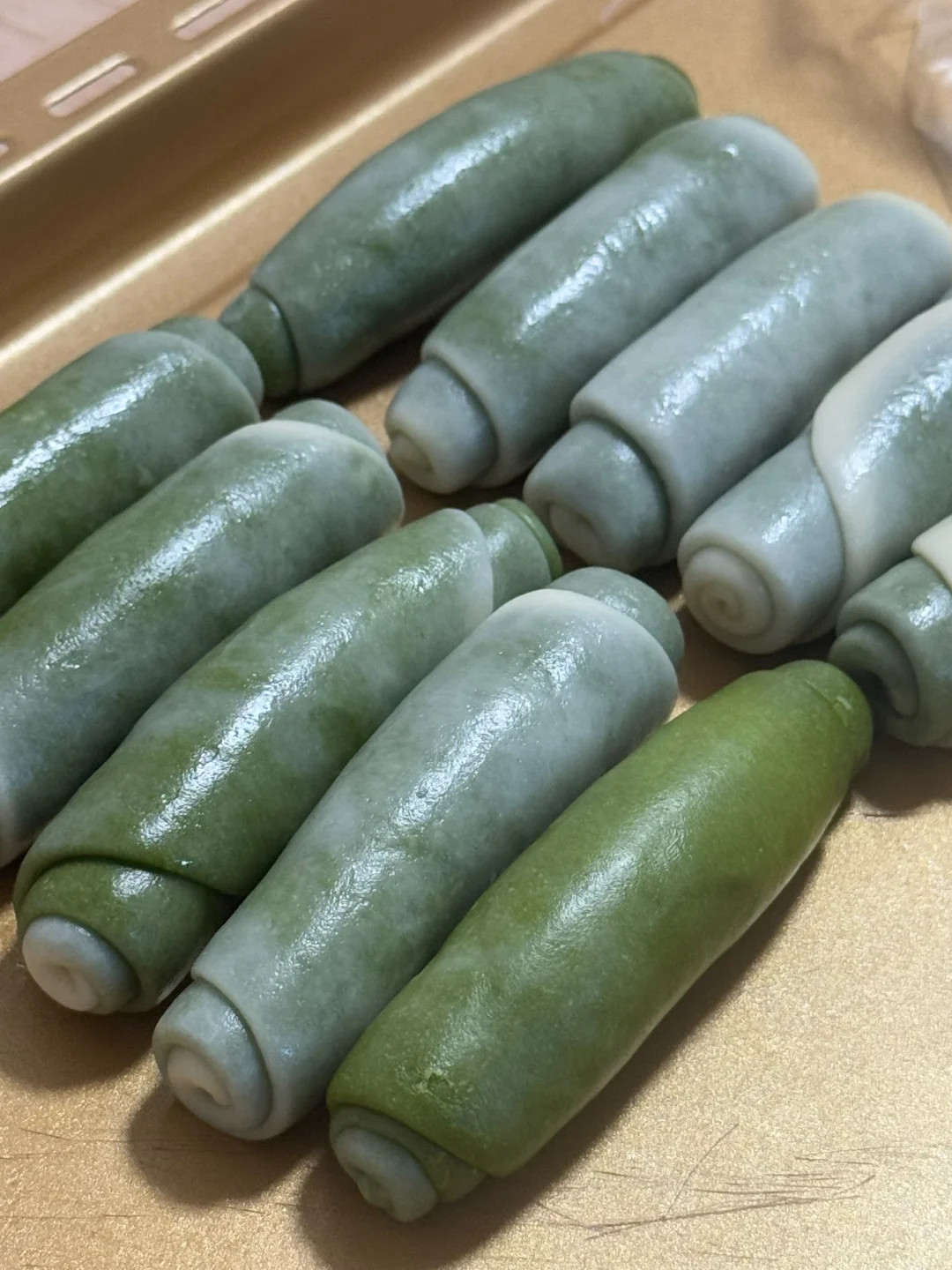 1.油皮油酥均分成10份,揉圆,油皮包入油酥,放冷藏15分钟(全程需要盖保鲜膜)取出,擀成牛舌状卷起,盖上保鲜膜,放冰箱松弛15分钟,再取出第一个、擀薄擀长卷起,再放冰箱冷藏15分钟。