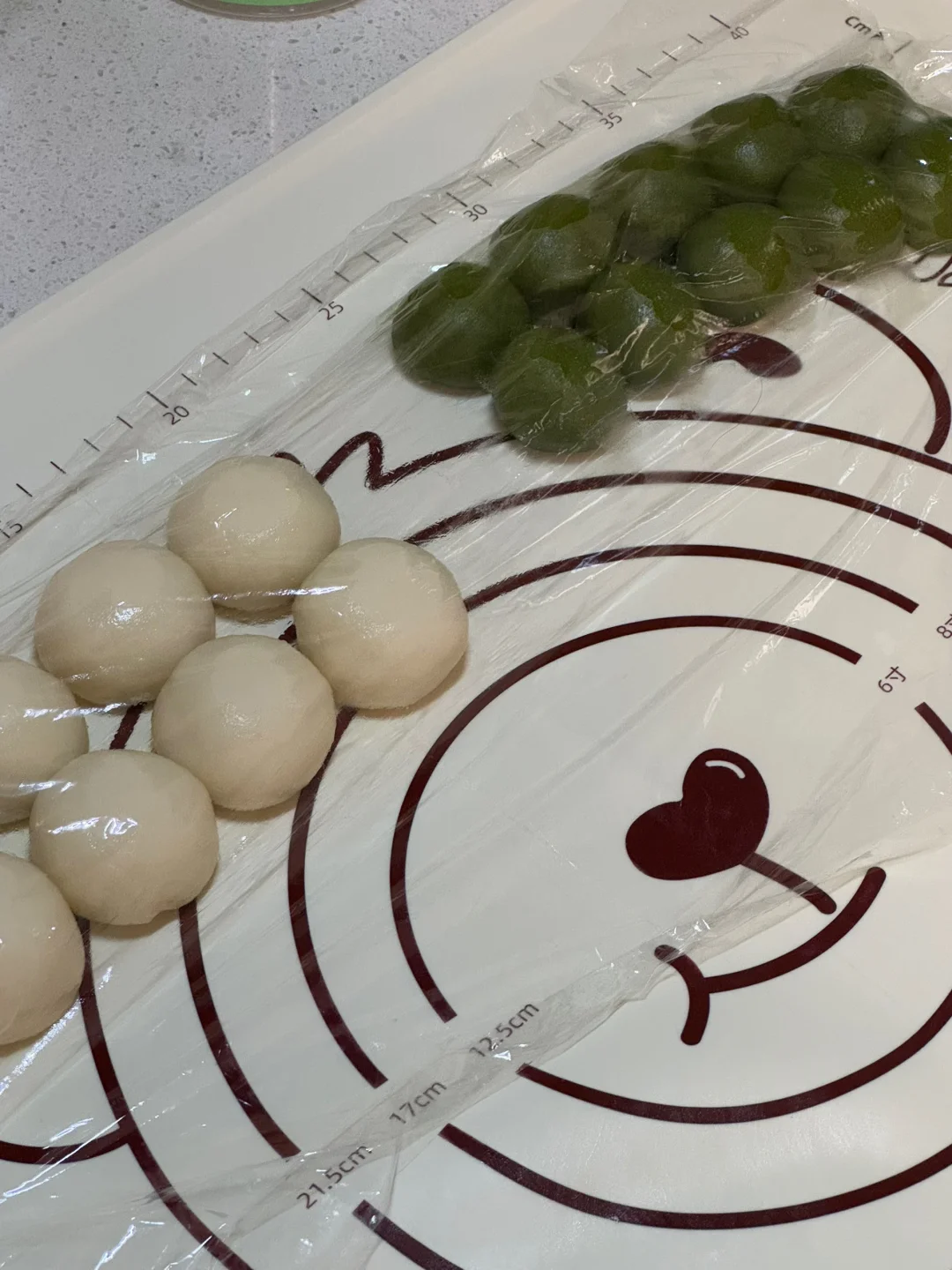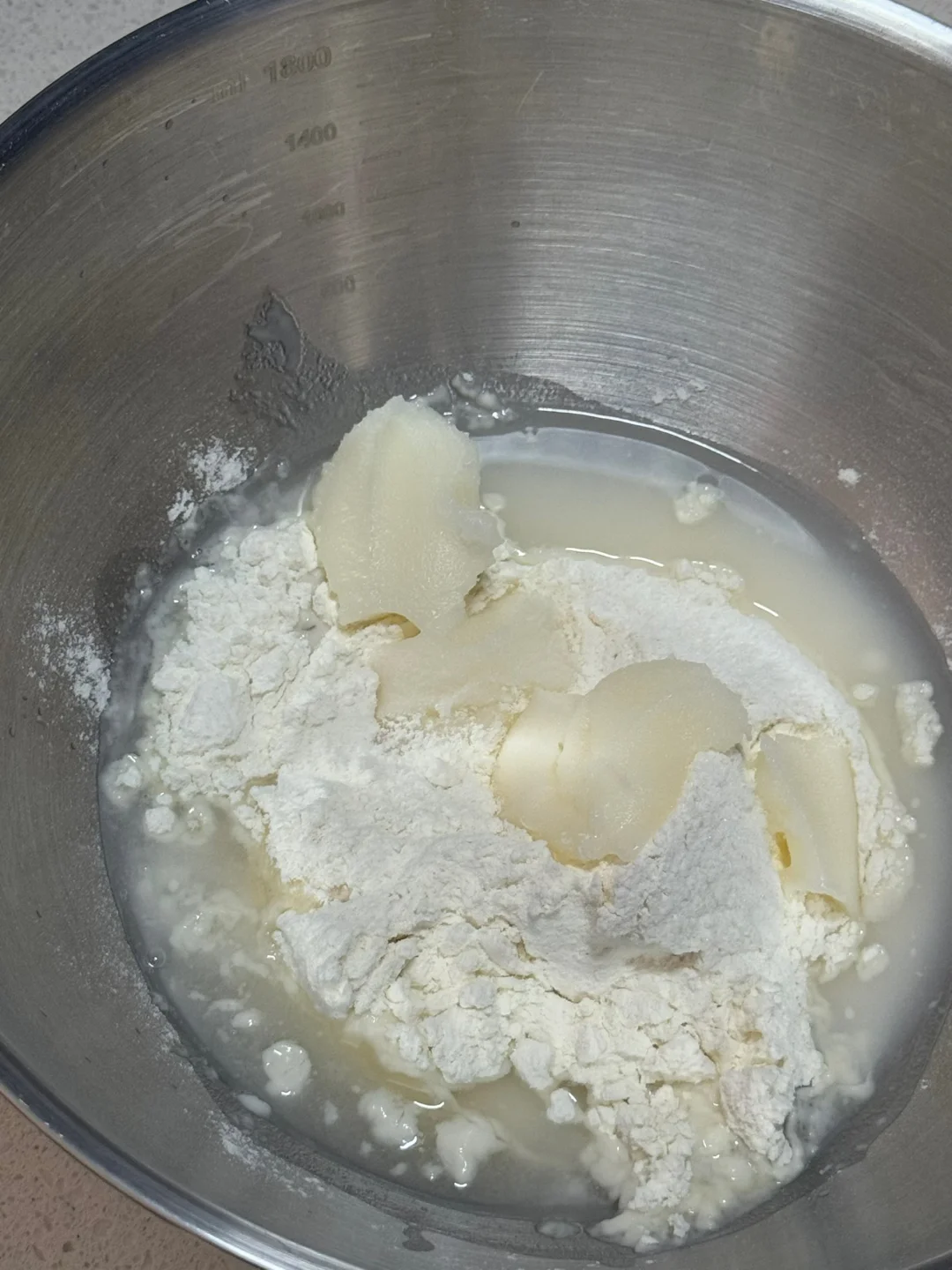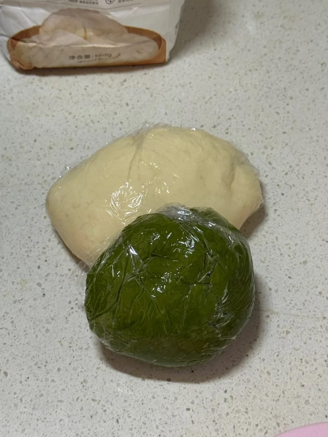 🌷油皮部分:油皮材料全部混合均匀,揉5-10分钟,揉光滑,裹上保鲜膜放冰箱冷藏1小时。