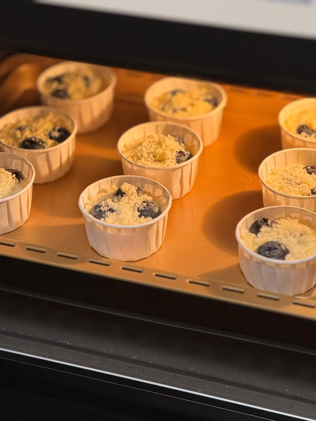 5.蛋糕糊糊装入裱花袋,挤入纸杯,每个杯子放三个蓝莓,再撒上酥粒。