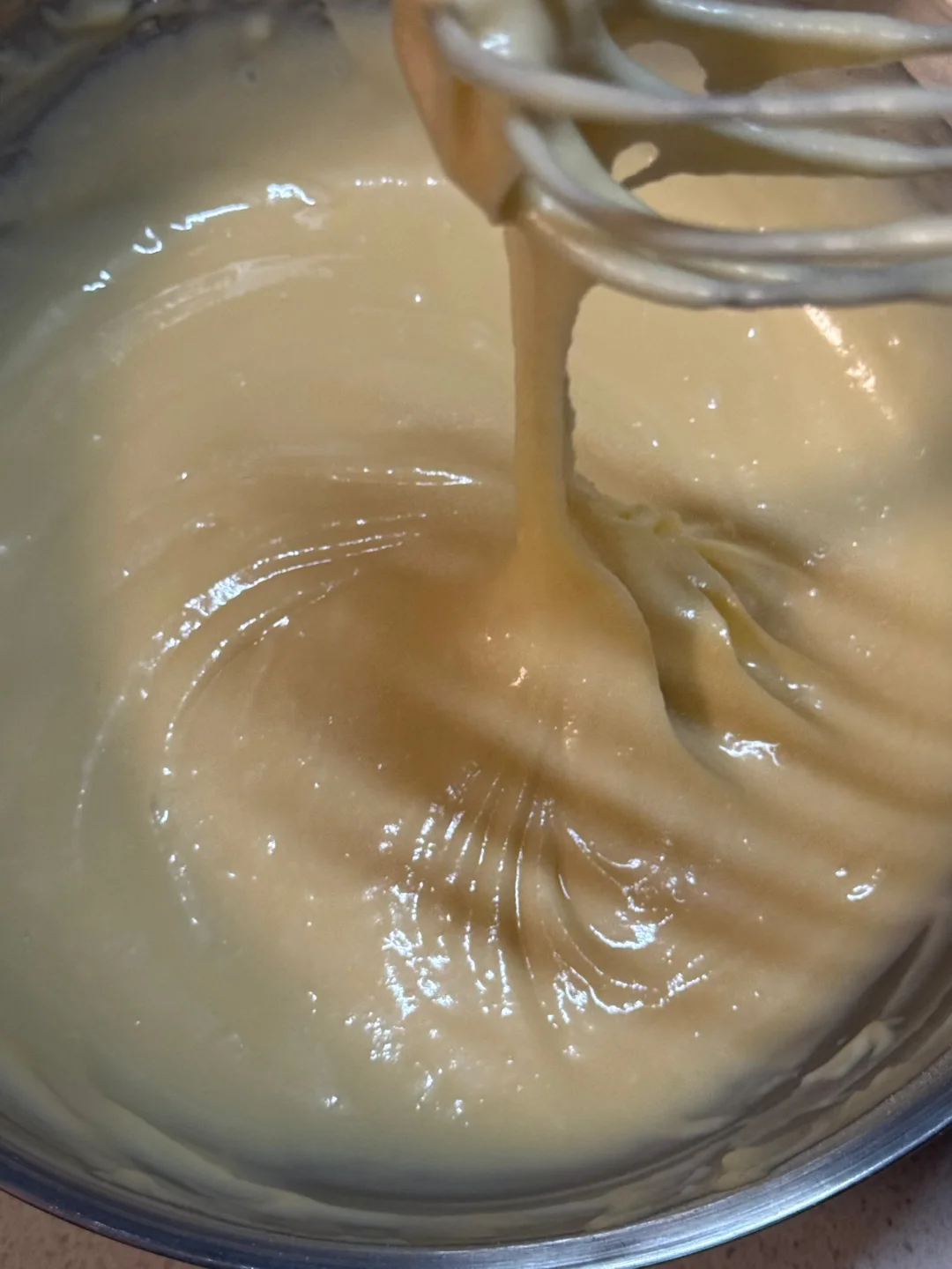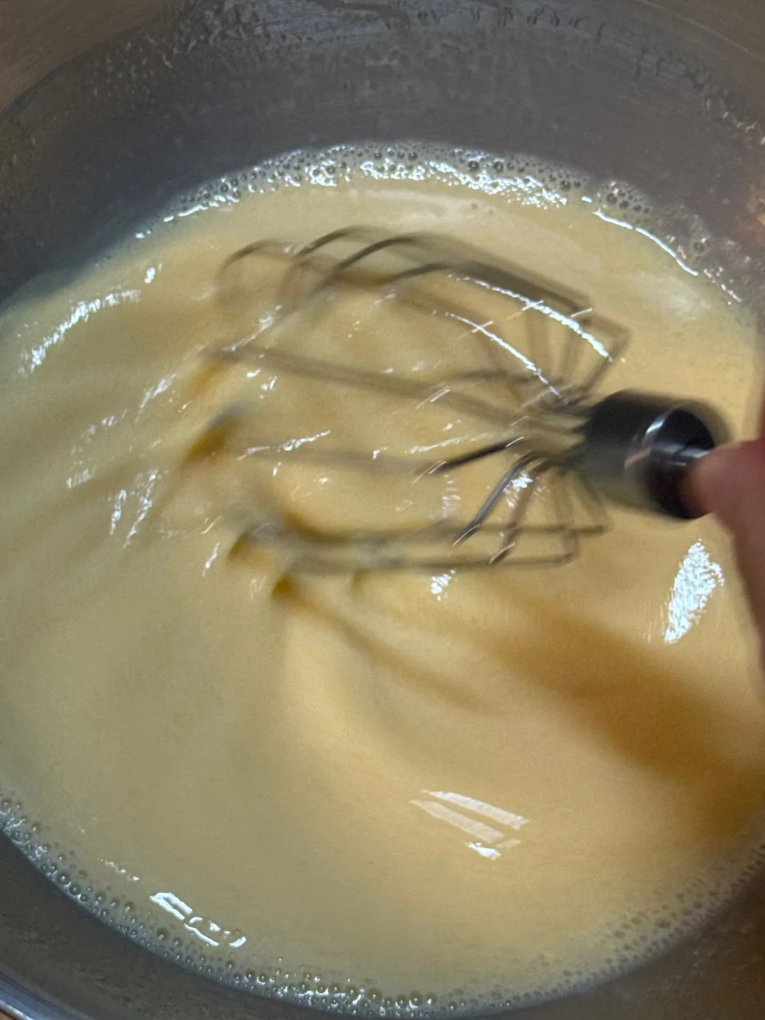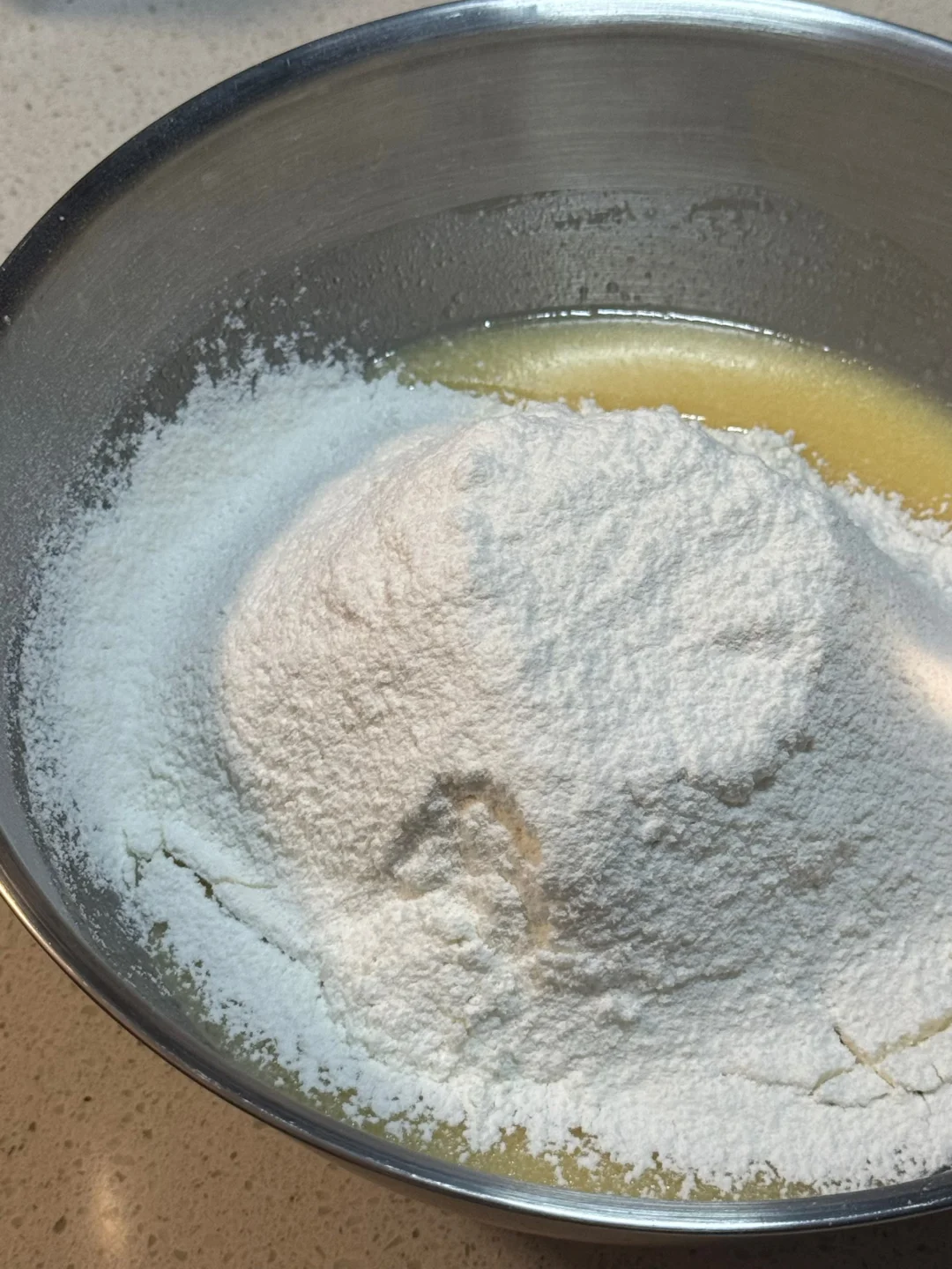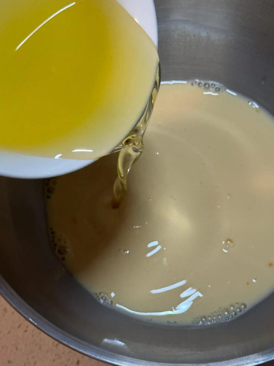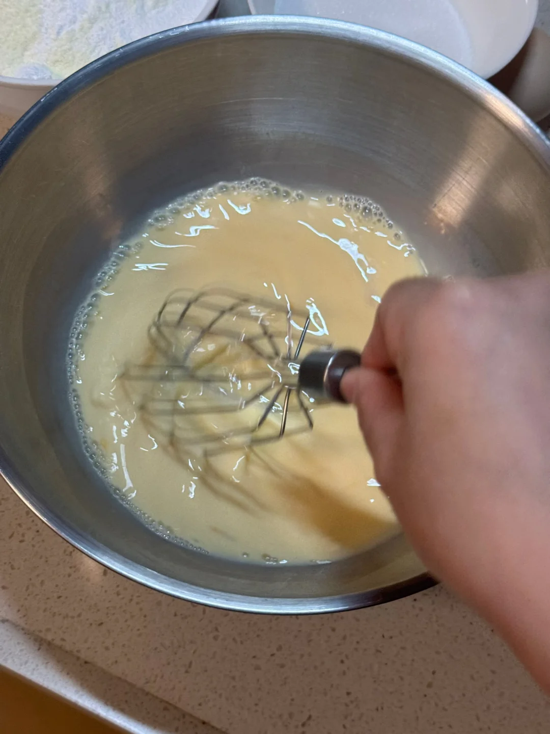 4.筛入低筋面粉、奶粉、泡打粉搅拌均匀。