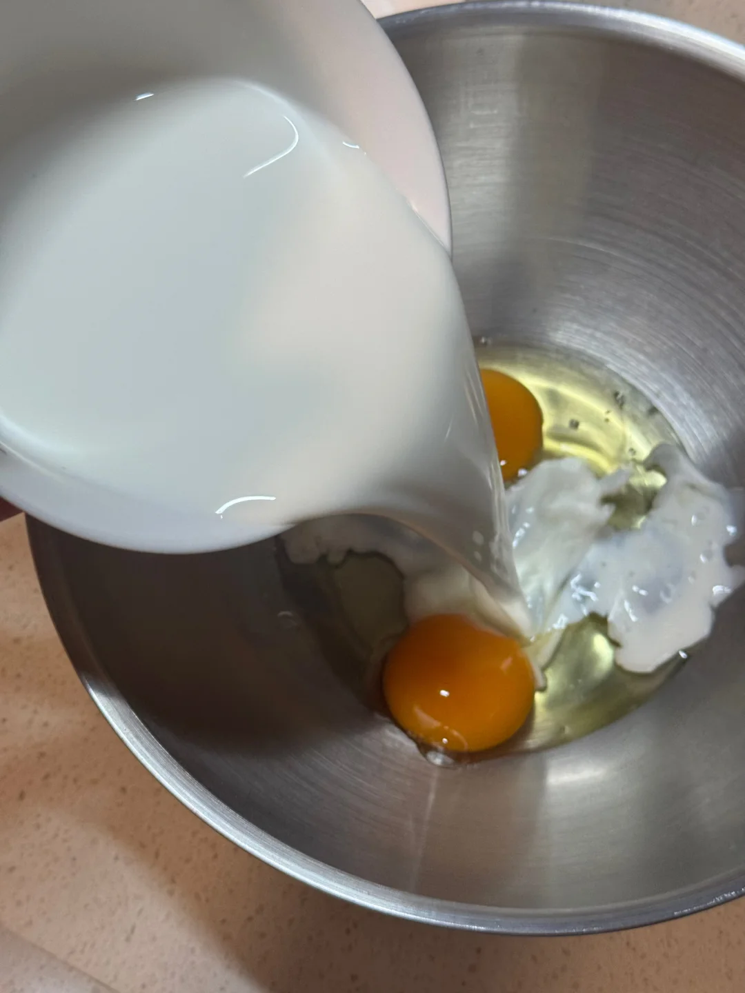 1.纯牛奶倒入鸡蛋中搅拌均匀。