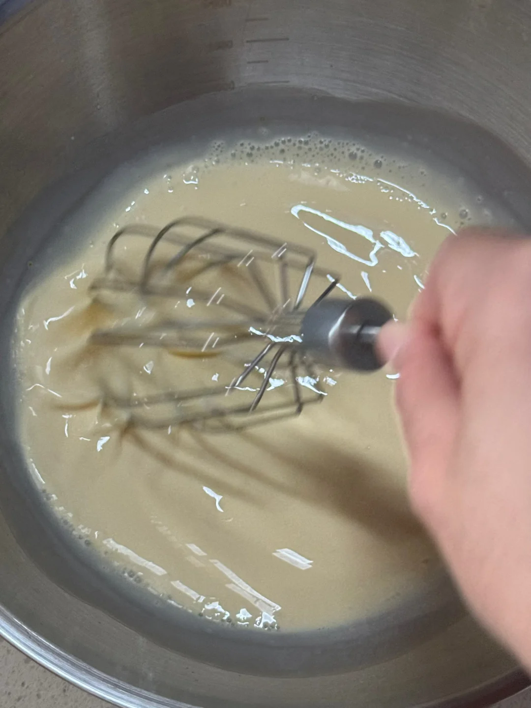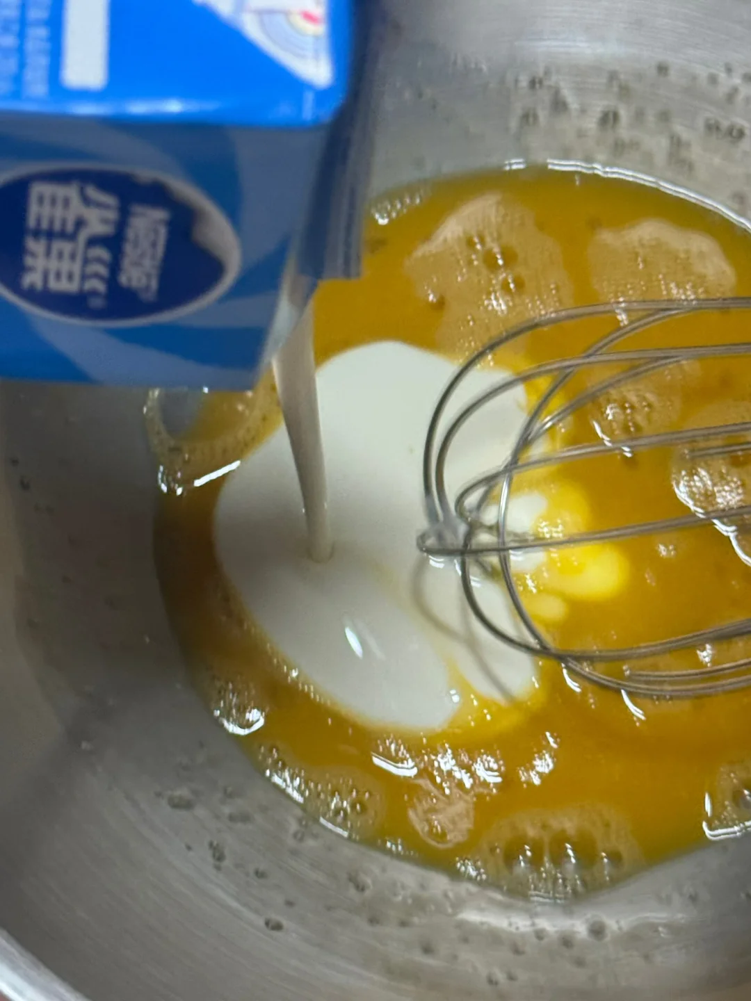 ⚠️切记,不要用电动打蛋器搅拌,用手动搅拌器搅拌即可,力度轻柔一些,烤出的蛋挞就不会蜂窝状!!!