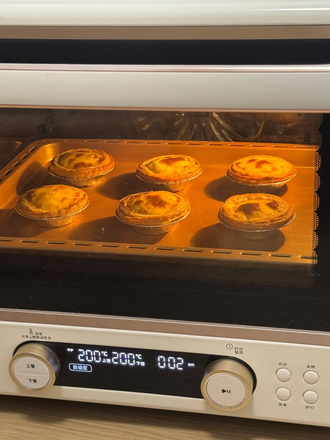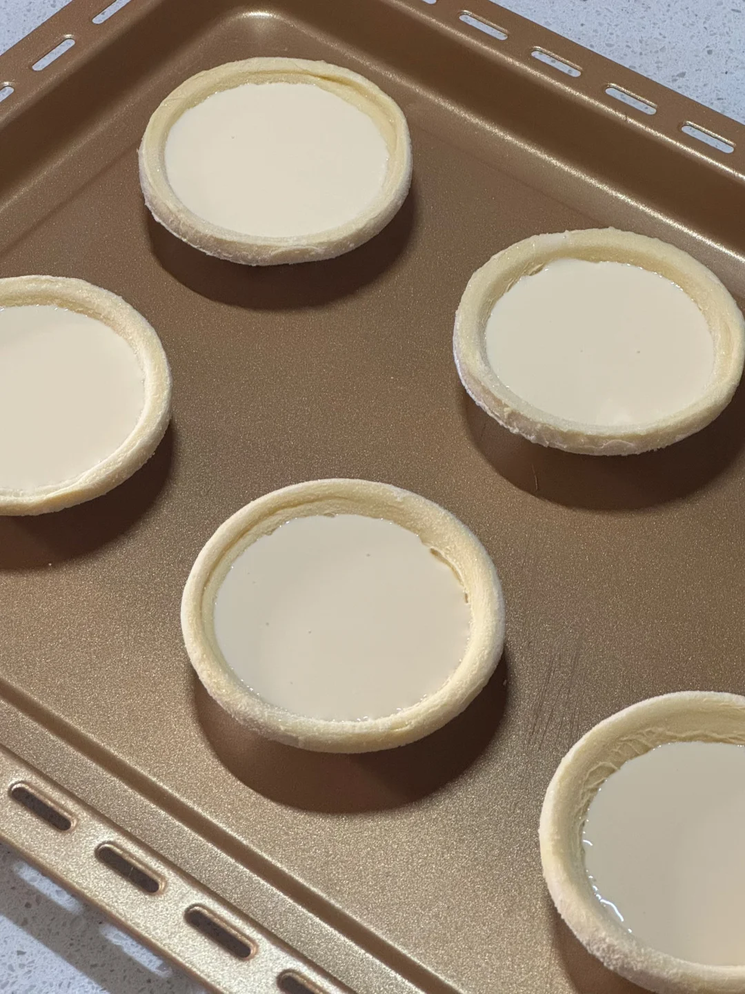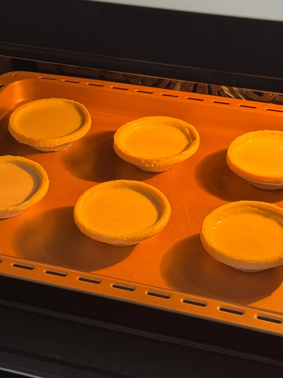 4. 烤箱提前预热,200度烘烤25分钟,再转220度烘烤5分钟,蛋挞液倒入蛋挞皮迅速放入预热好的烤箱,不然会湿底,如果湿底,可多烤几分钟(每个烤箱脾气不一样,慢慢摸索。