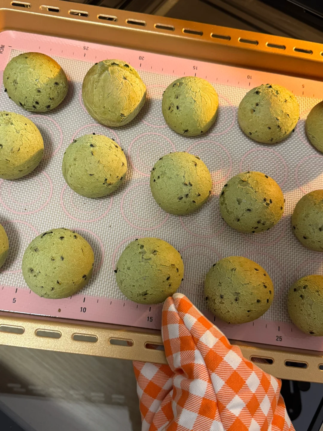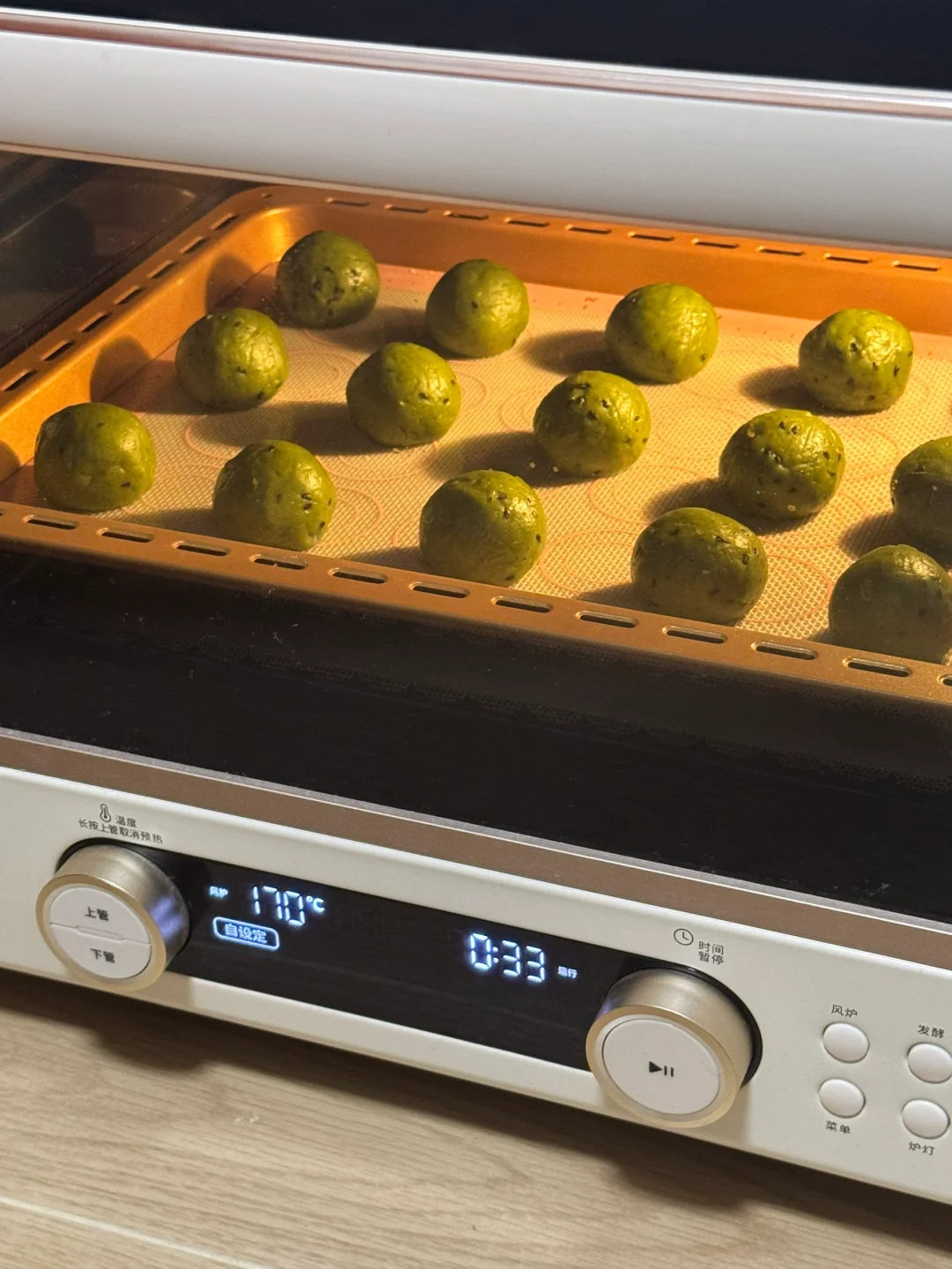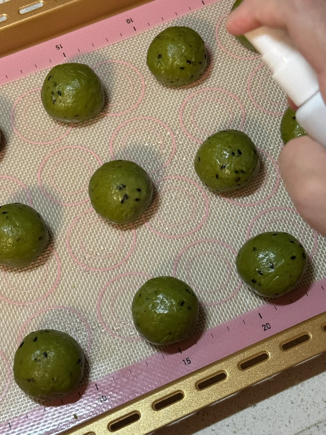 3.面团均分成15分,一个大概29g,依次揉圆,烤箱提前预热,麻薯入炉前喷水(防止烘烤的时候干裂)170度烘烤35分钟。