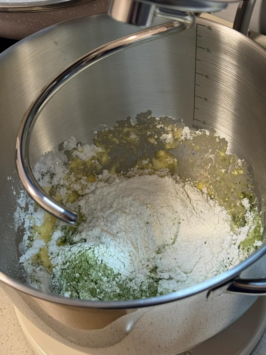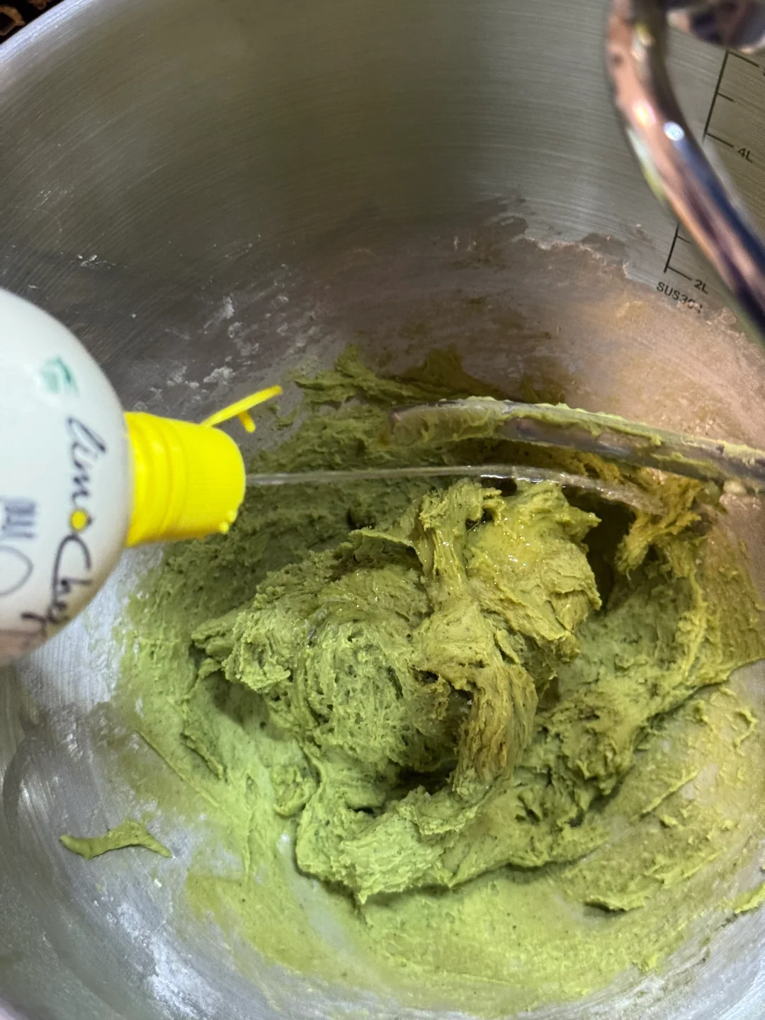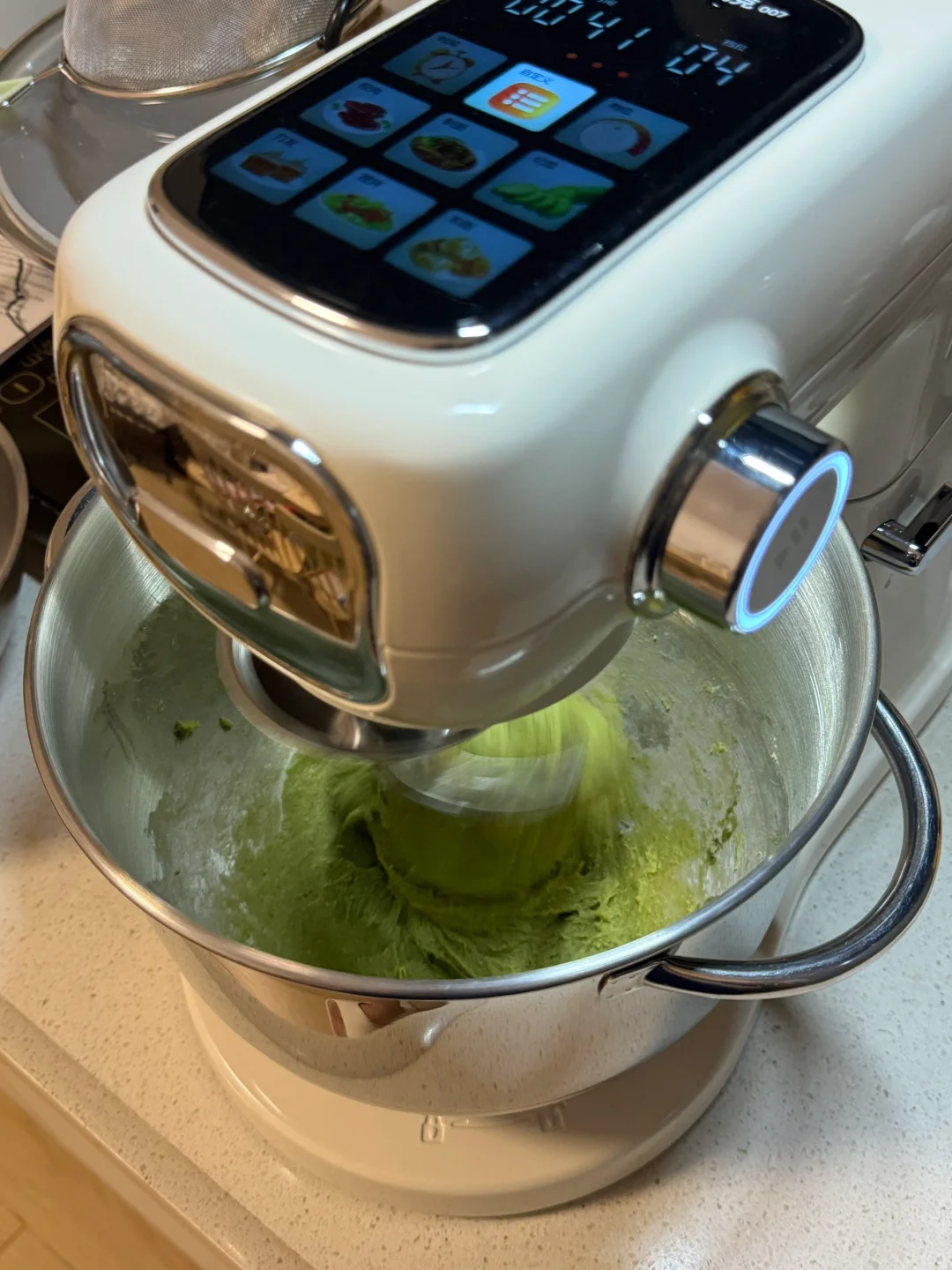 2.加入预拌粉、抹茶粉,用厨师机3档3分钟搅拌至无干粉,再4档2分钟,滴几滴柠檬汁去蛋腥味,再加入黄油45g,揉进面团,4档2分钟,加入黑芝麻,最后再3档1分钟(只要揉均匀就可以暂停)