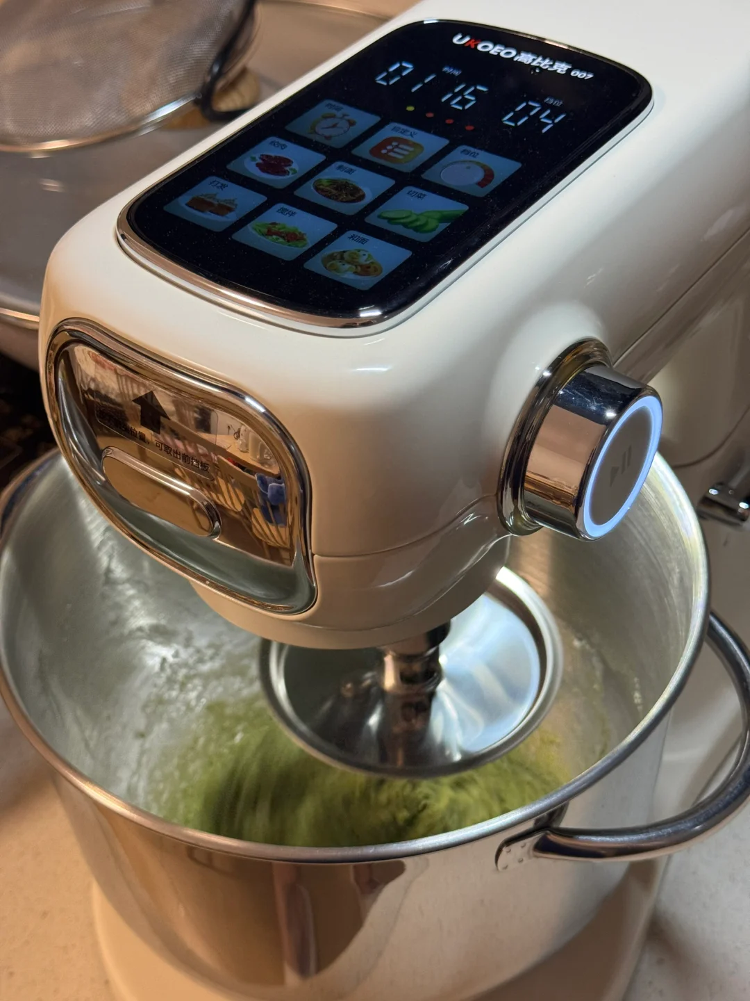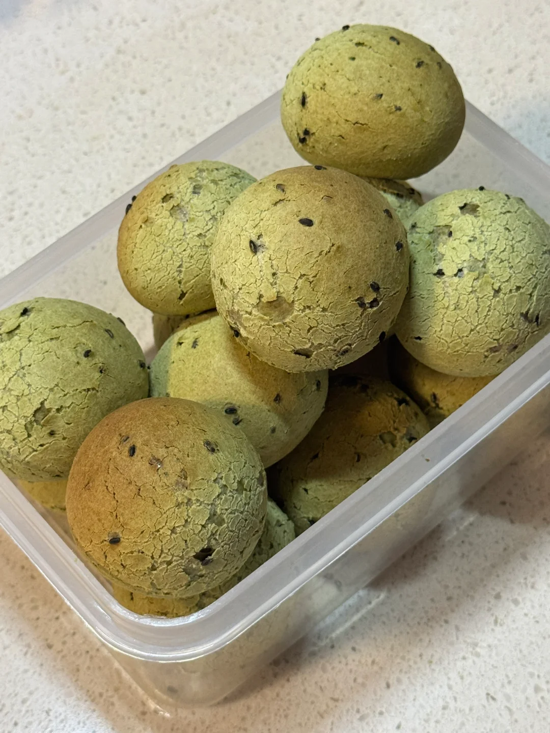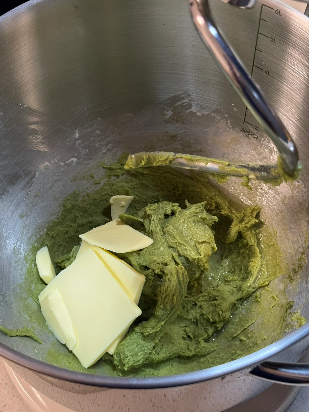2.加入预拌粉、抹茶粉,用厨师机3档3分钟搅拌至无干粉,再4档2分钟,滴几滴柠檬汁去蛋腥味,再加入黄油45g,揉进面团,4档2分钟,加入黑芝麻,最后再3档1分钟(只要揉均匀就可以暂停)