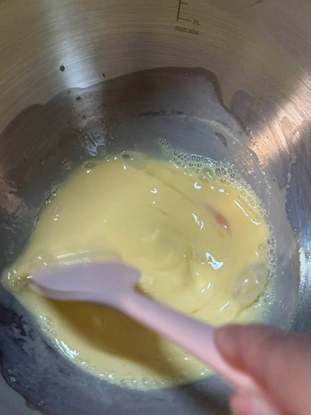 1.鸡蛋、纯牛奶、盐搅拌均匀(可以隔热水搅拌,能让麻薯发的更大一些)