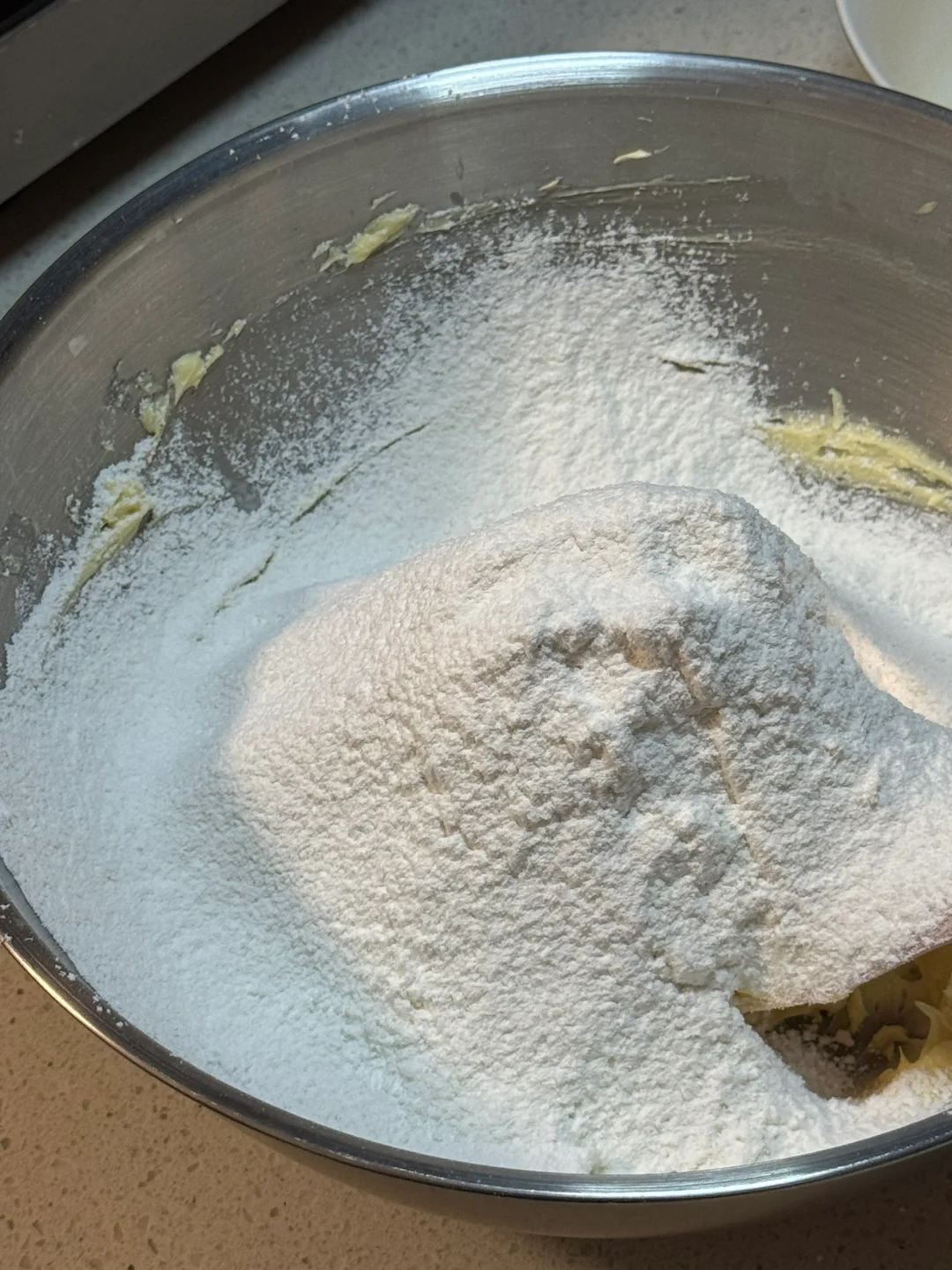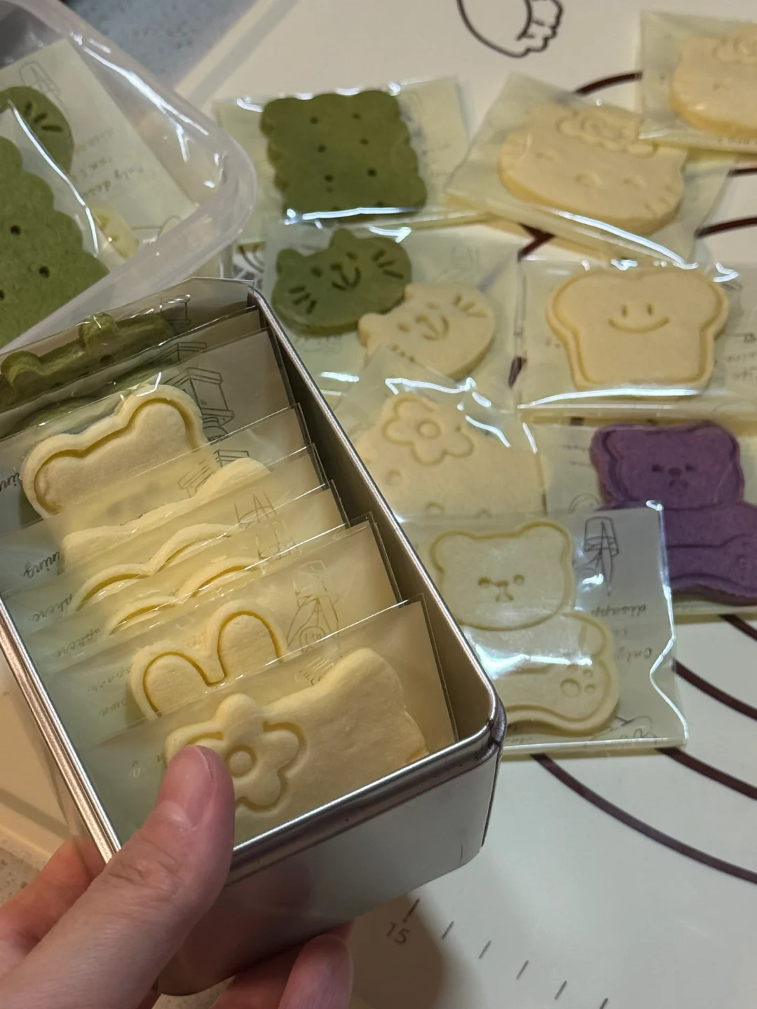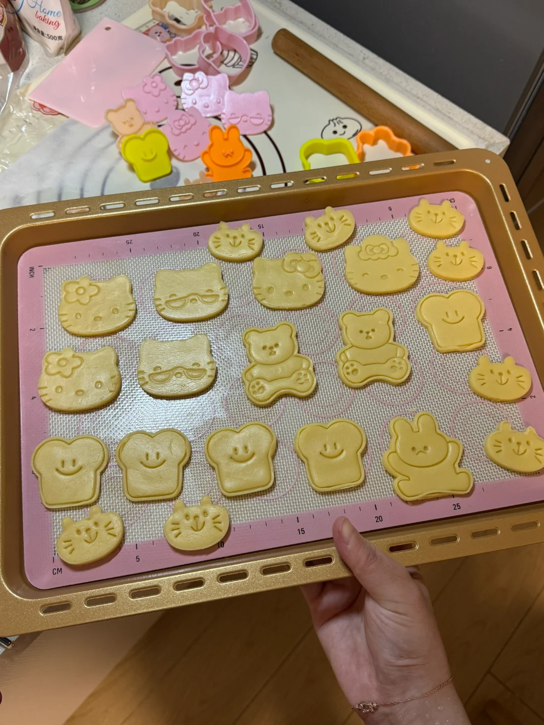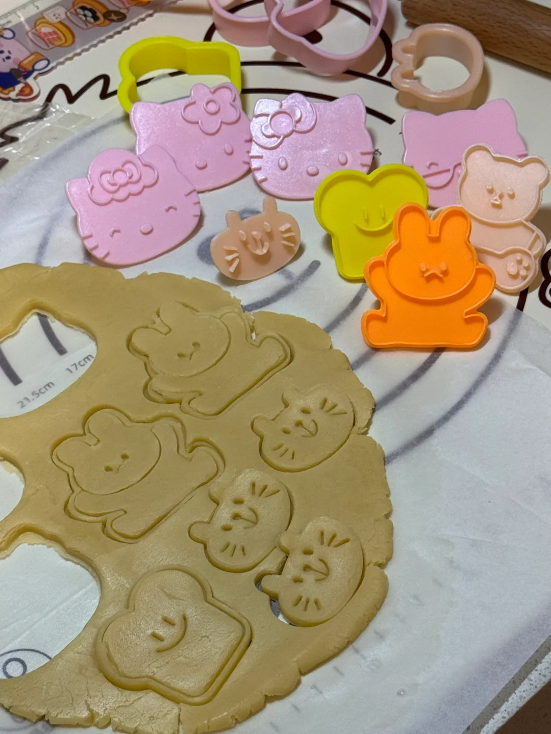 3.过筛加入低筋面粉(想要更好吃的可以加一些奶粉、杏仁粉)抓捏成团,面团平均分成两份,擀成薄片,放冰箱冷冻后刻出喜欢的图案。