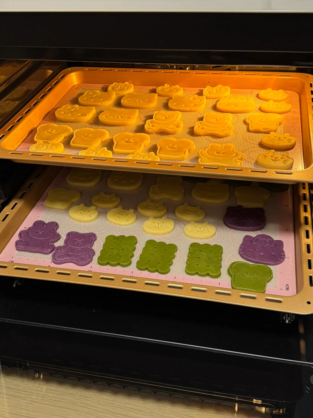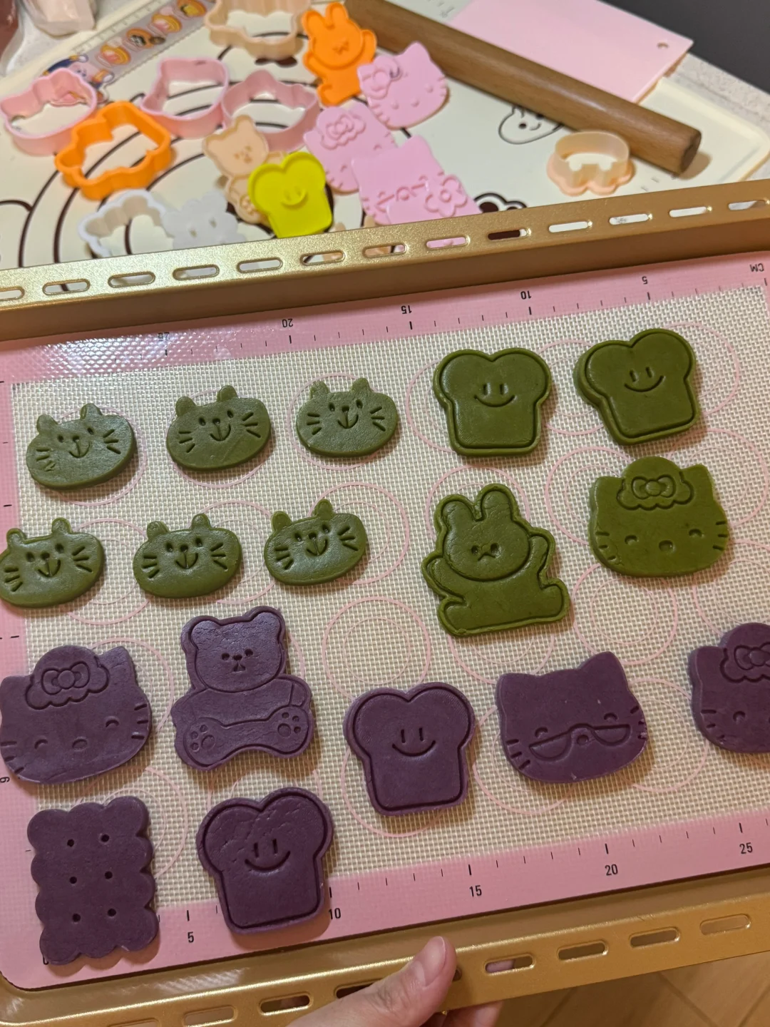 4.抹茶口味、紫薯口味跟上面的做法一样,只是在加入低筋粉的基础上加入抹茶粉、紫薯粉同样拌均,抓捏成团(但不要过度揉搓,不然烘烤出来的饼干表面不平整)擀成面片,放冰箱冷冻。