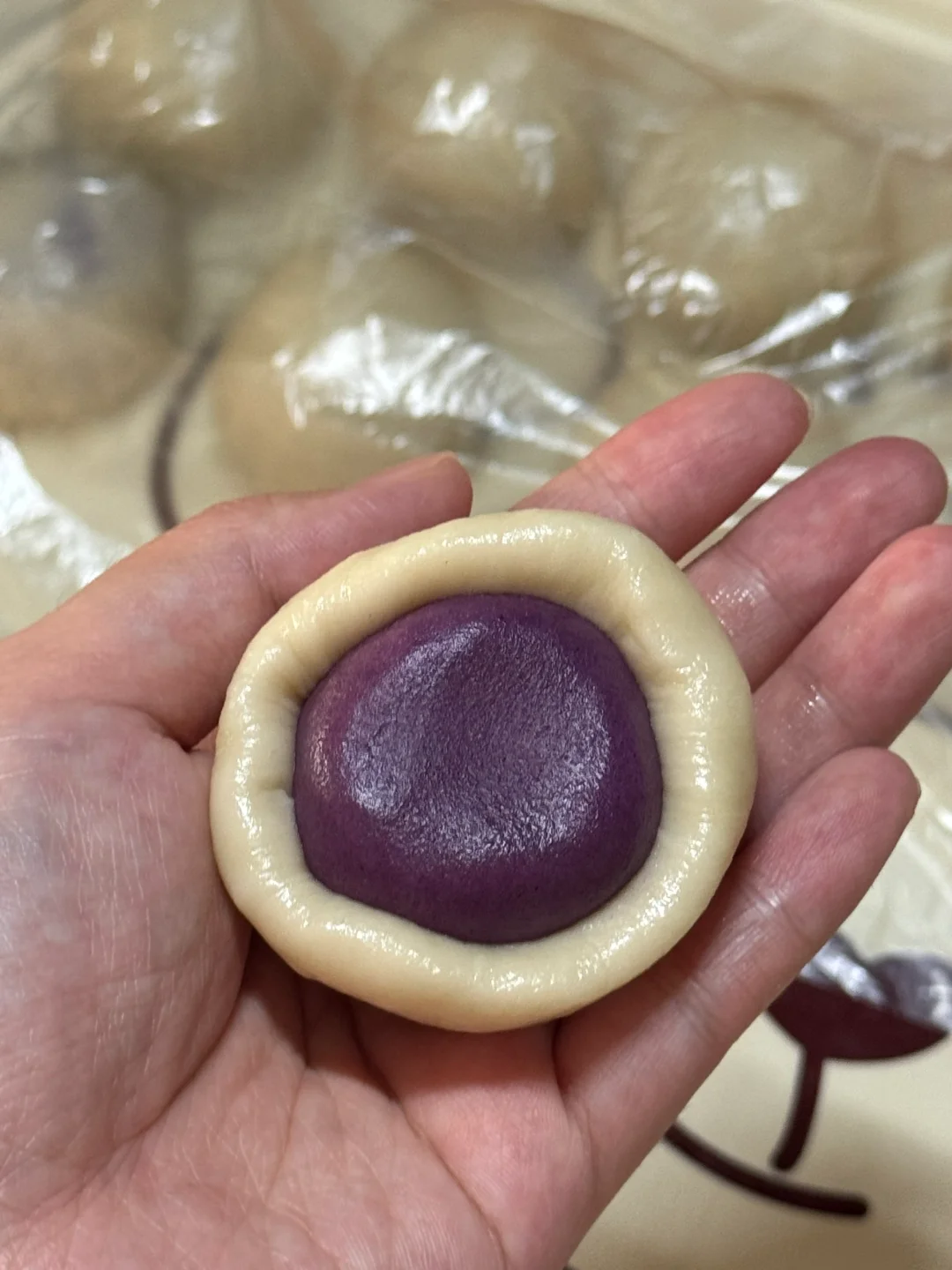 4.松弛时候进行第二次擀卷,重复前面的操作,取出一个,从中间切开,切面朝上,按压成圆形,翻面,擀面杖轻轻的像四周擀开,包入准备好的馅料,虎口收紧,滚圆。
