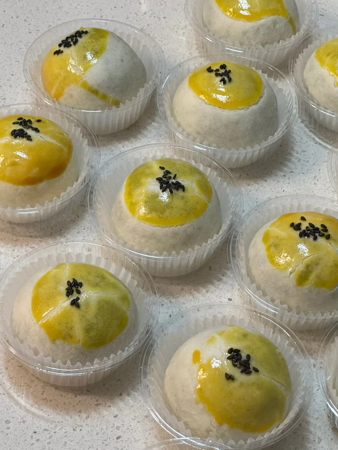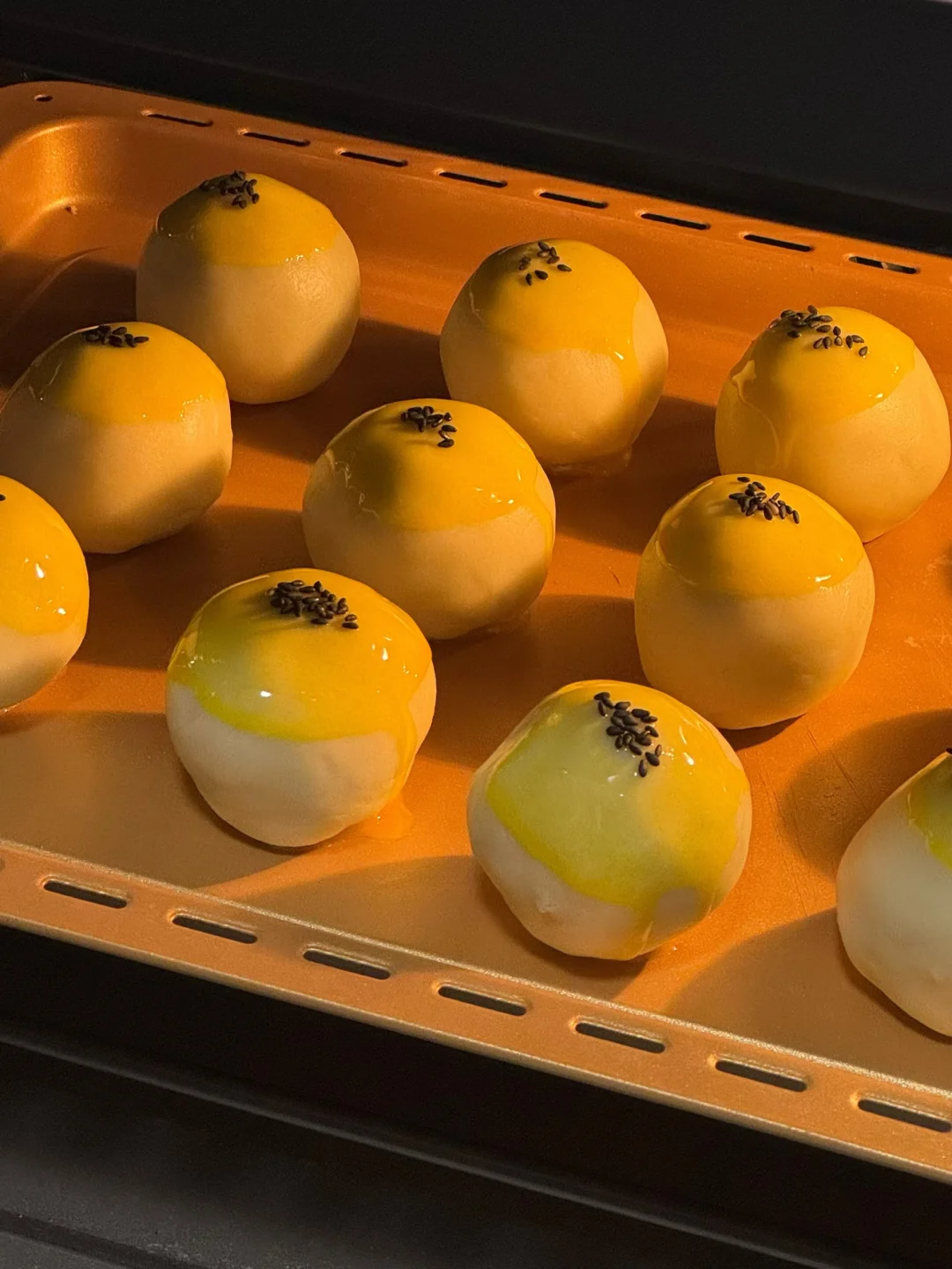4.做好的抹茶奶酪酥沾上蛋黄液(蛋黄液可以提前冷藏或者冷冻就不会流动)撒上黑芝麻,再依次摆入烤盘。