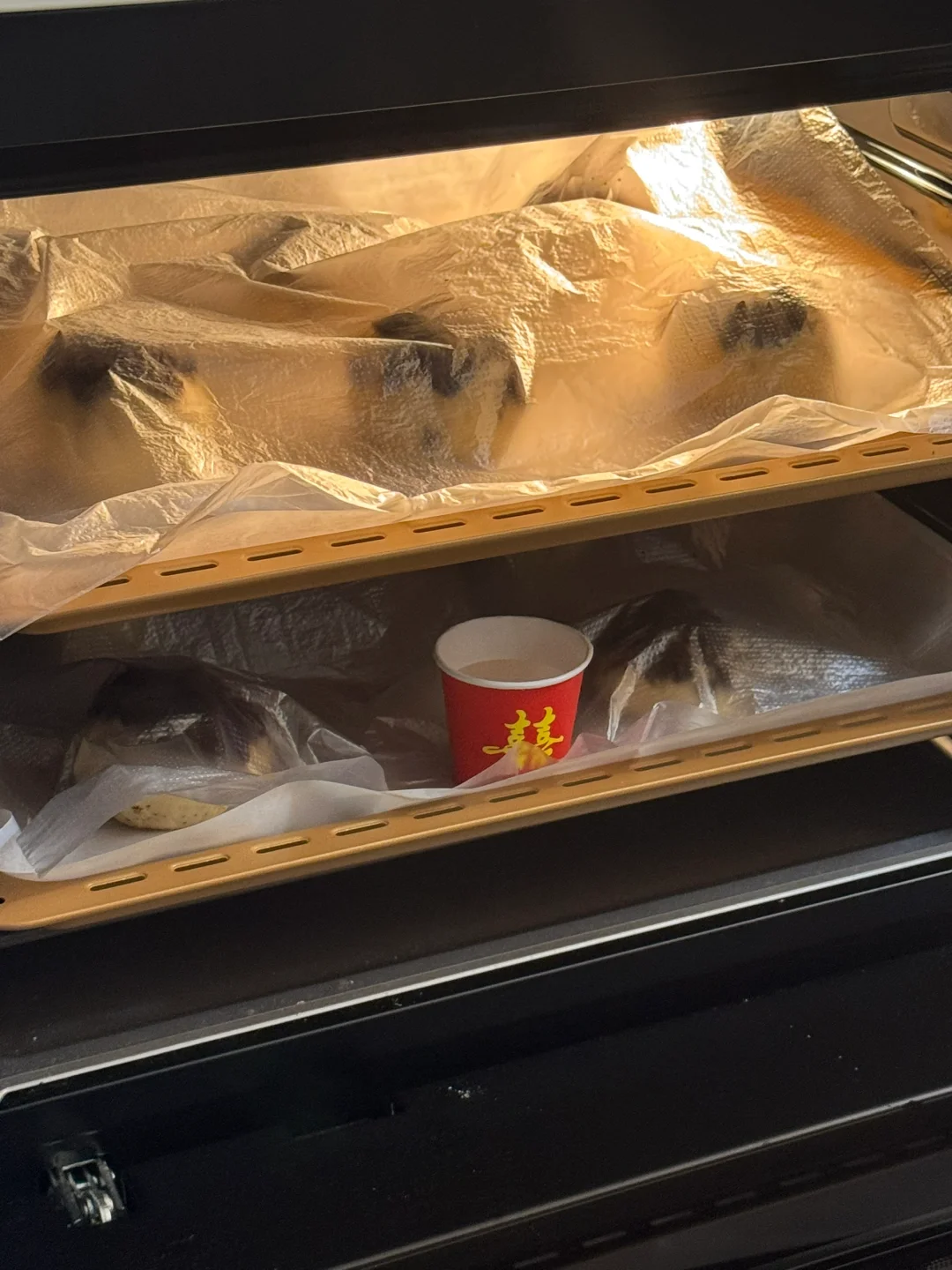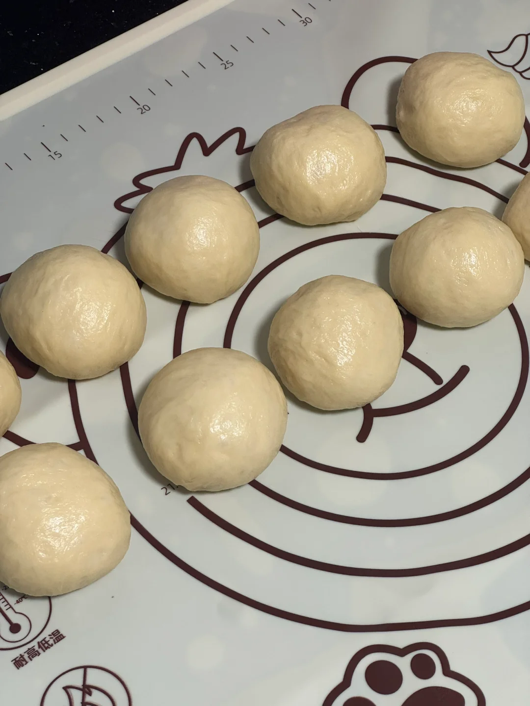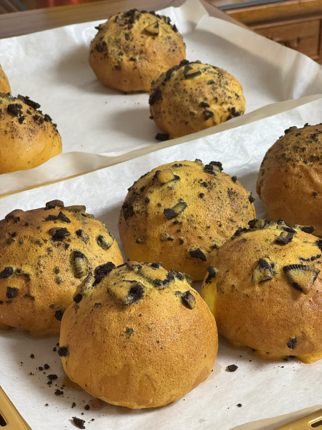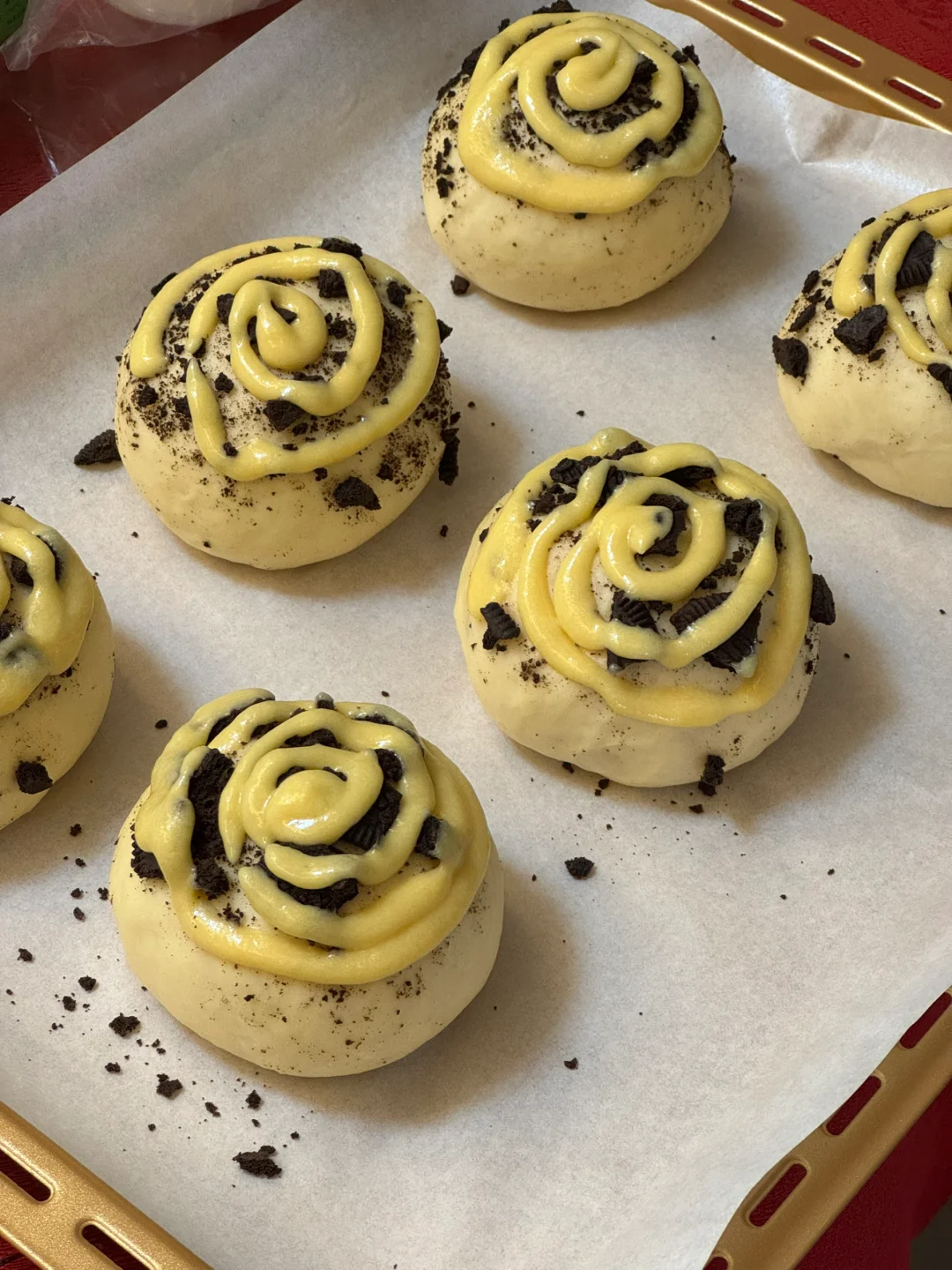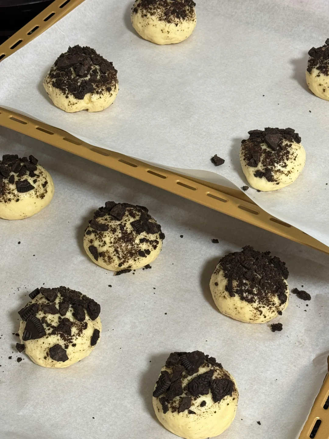 2.发酵好的面团,拿出排气,平均分成10份,搓圆,表面喷水,滚一圈奥利奥碎,放入烤箱进行二发(33度发酵40分钟)