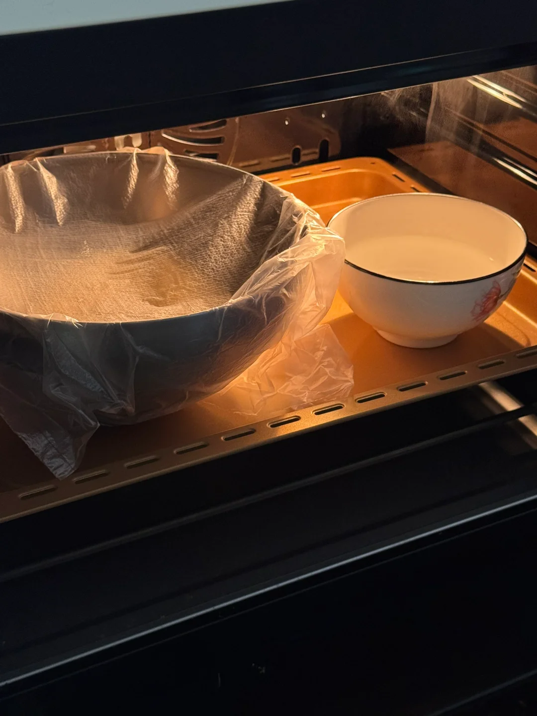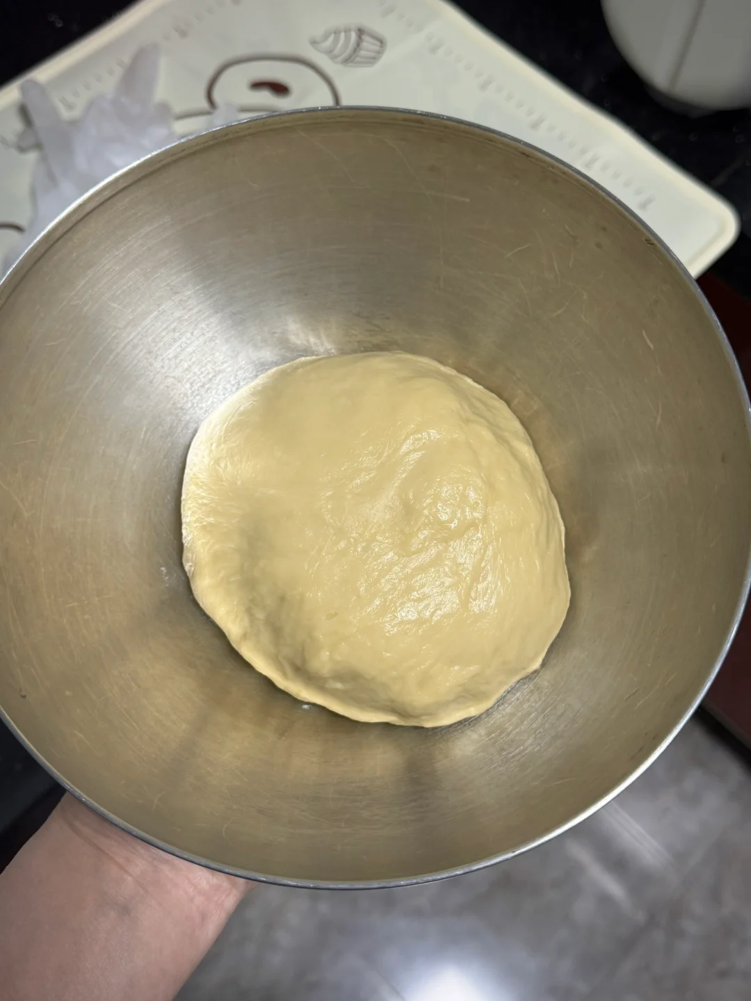 1.除黄油、盐以外的食材放入面包机中揉出厚膜,再加入黄油、盐揉出手套膜,取出面团烤箱发酵至两倍大。(烤箱28度发酵至1小时)