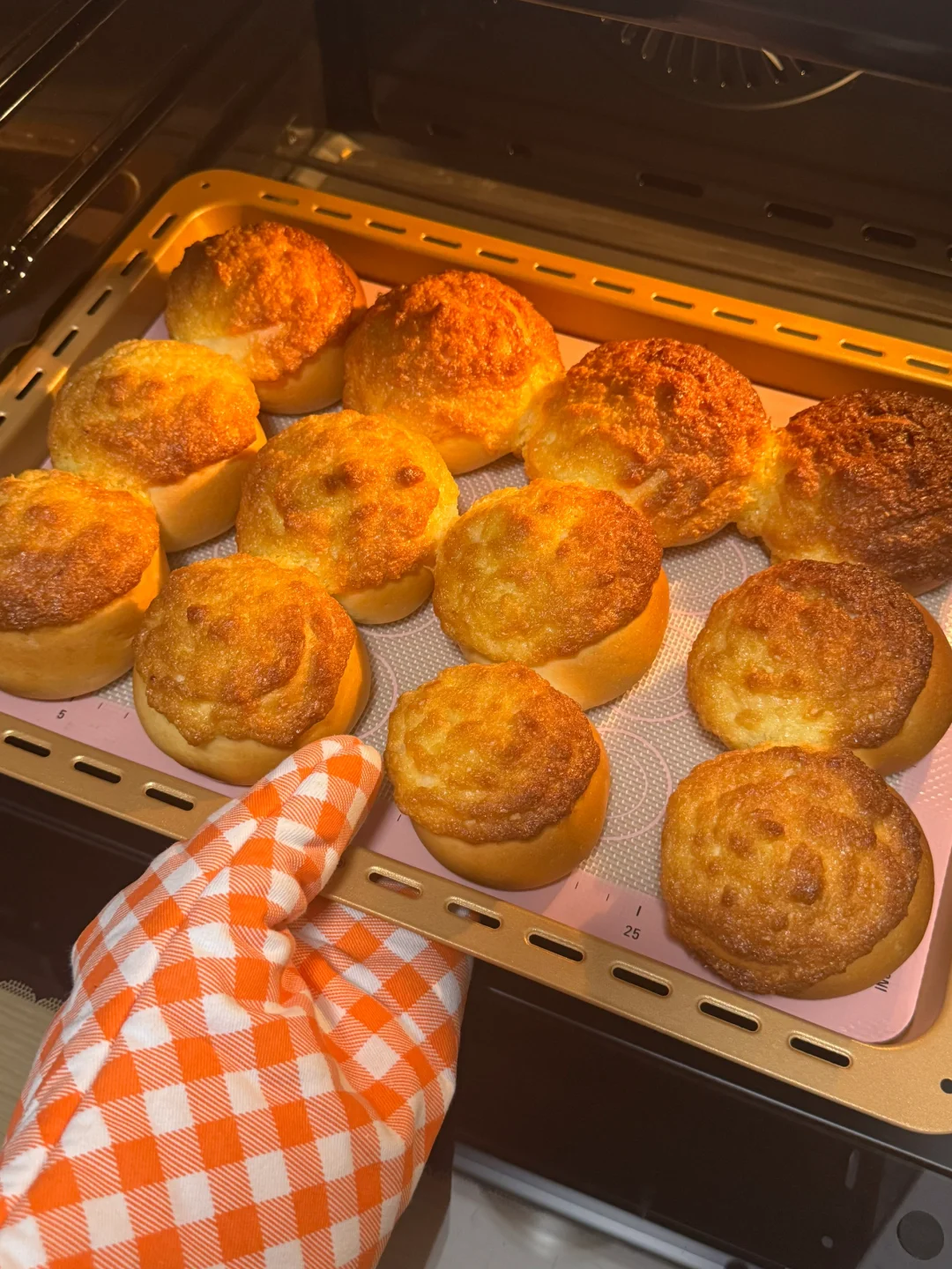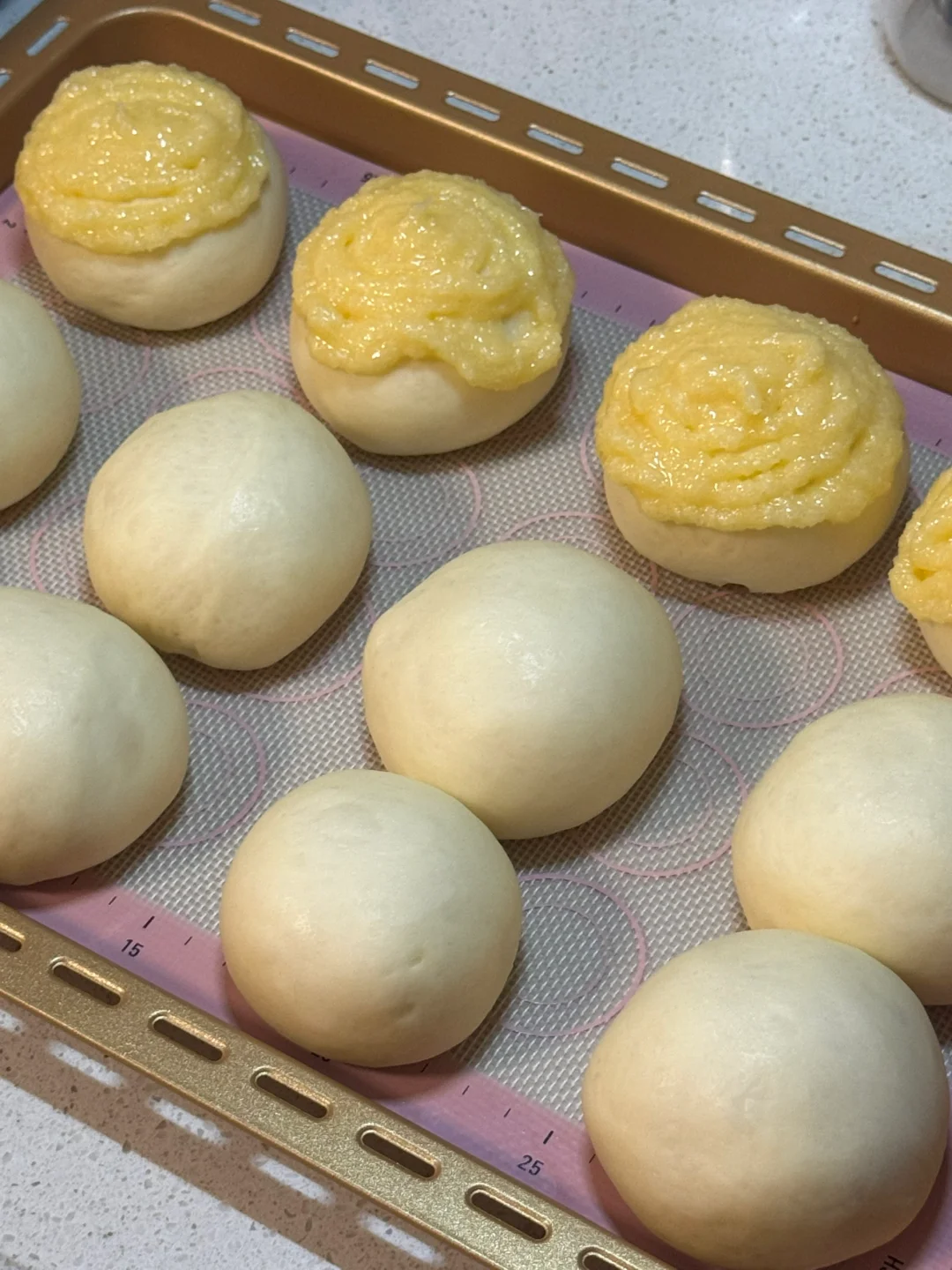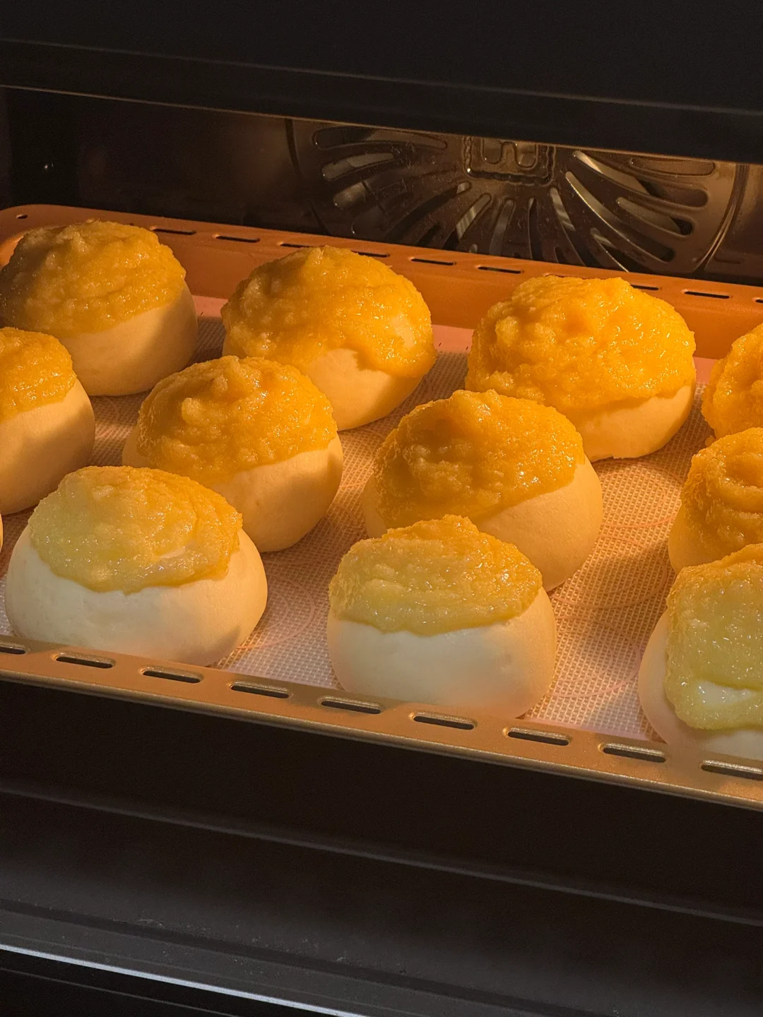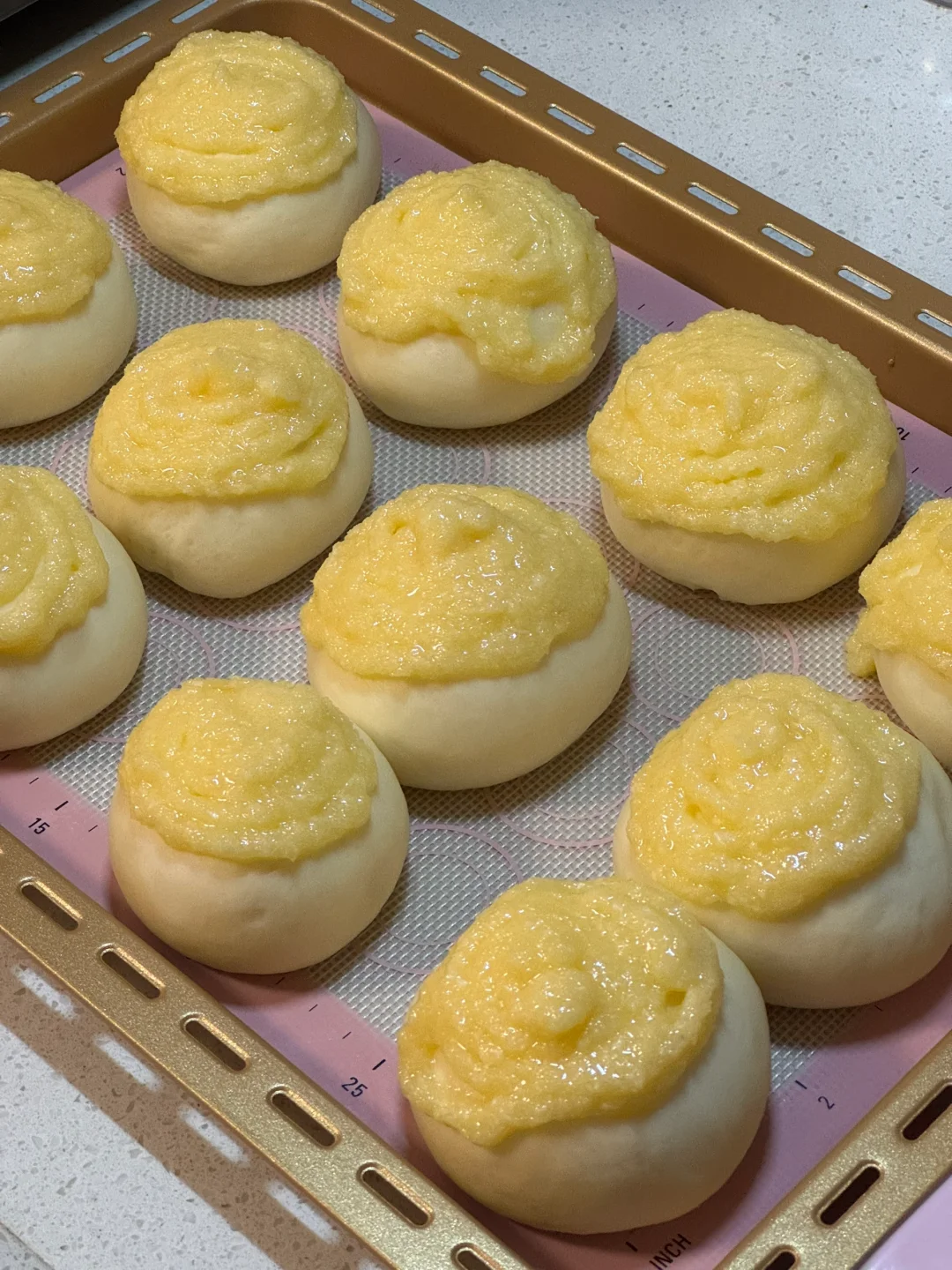 5.发酵好之后面包体表面挤上椰蓉酱,烤箱提前预热烤箱170度烘烤25分钟左右(中途观察上的情况,可以盖上锡纸防止上色过深)