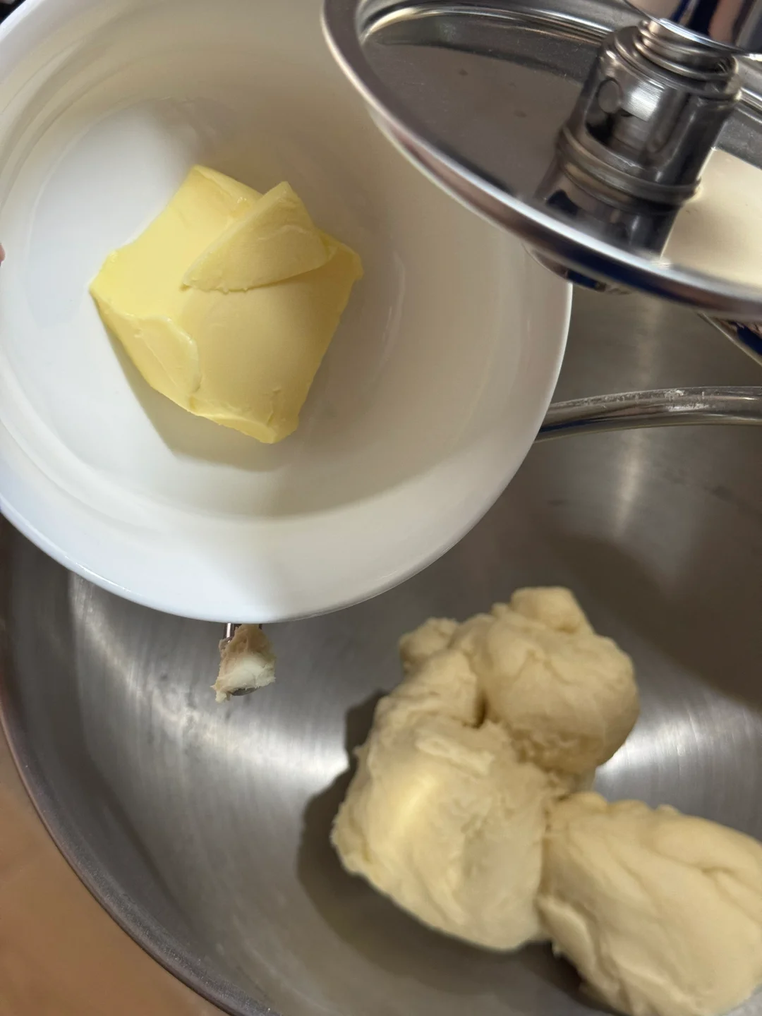 1.除黄油所有食材全部放入厨师机中,3档2分钟5档5分钟,加入黄油,2档3分钟转6档5分钟揉出手套膜。