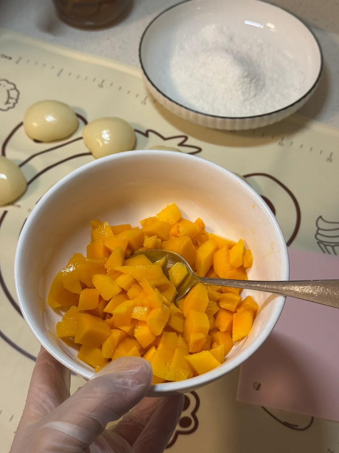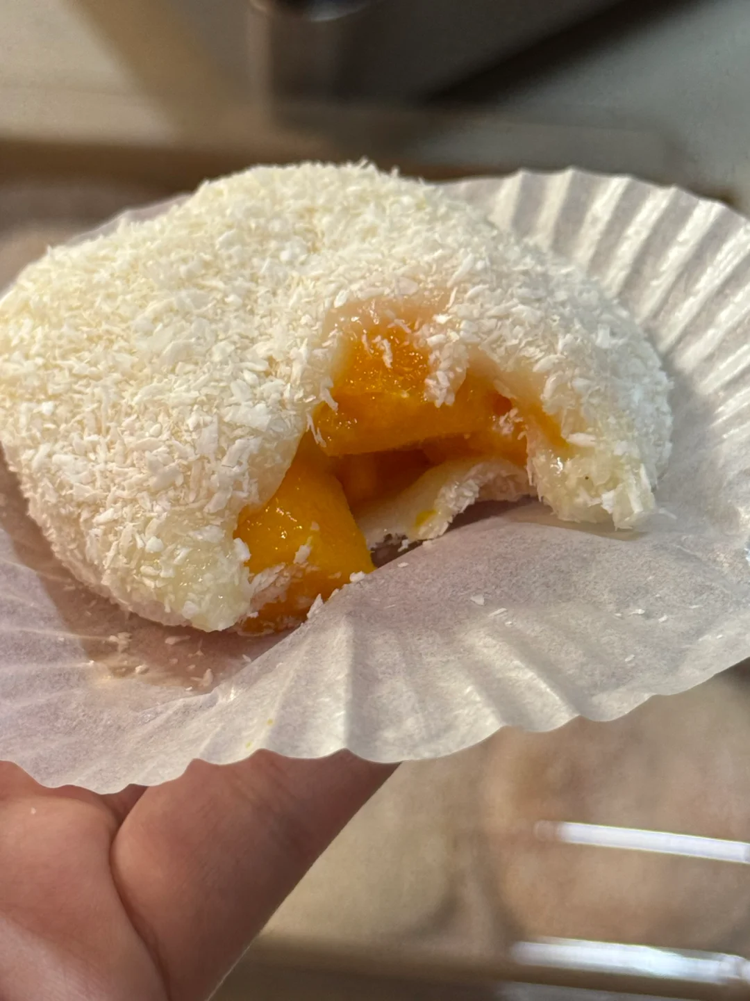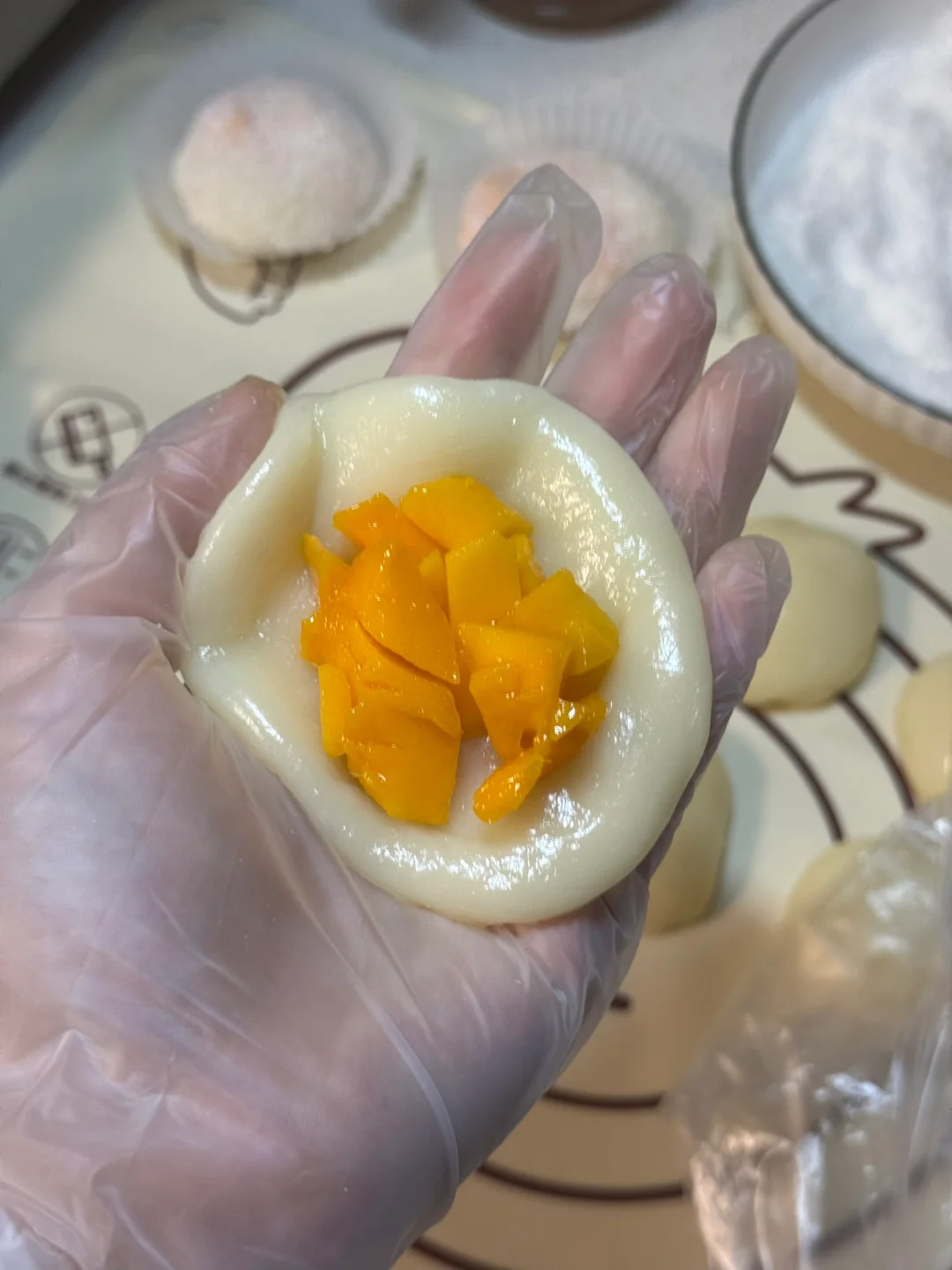 4.把冷藏好的面团分成40g的小面团 ,用手压成厚饼状,放入芒果然后像捏包子一样捏紧,多余的拿剪刀剪掉,再裹上椰蓉。