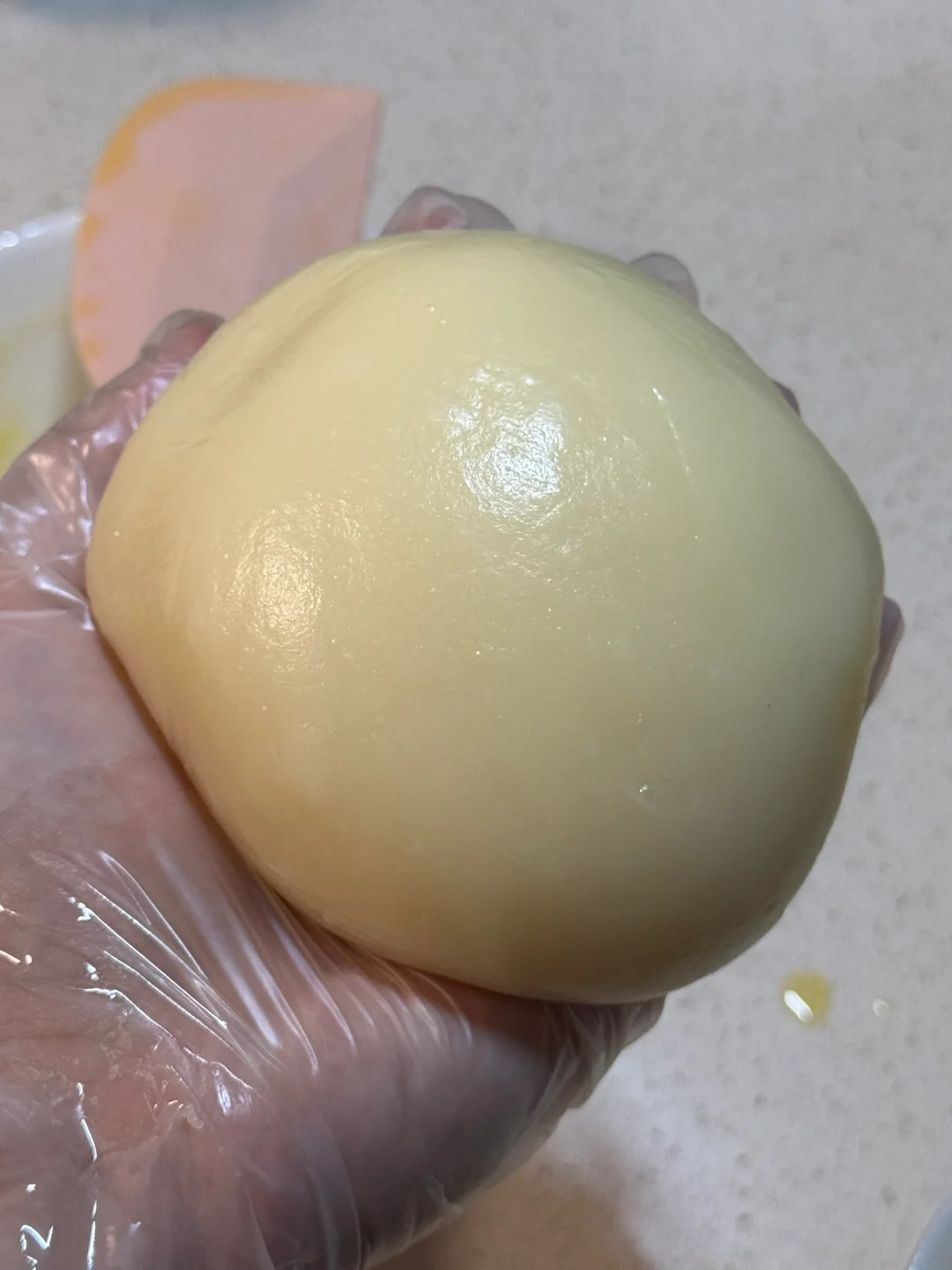3.加入黄油,趁热揉面粉团(太烫了我都是先用耐高温刮刀先戳几下,等到温度手可以承受了带上一次性手套开始揉,来回不断拉扯(大概五分钟,更有韧劲)放冰箱,冷藏1小时。