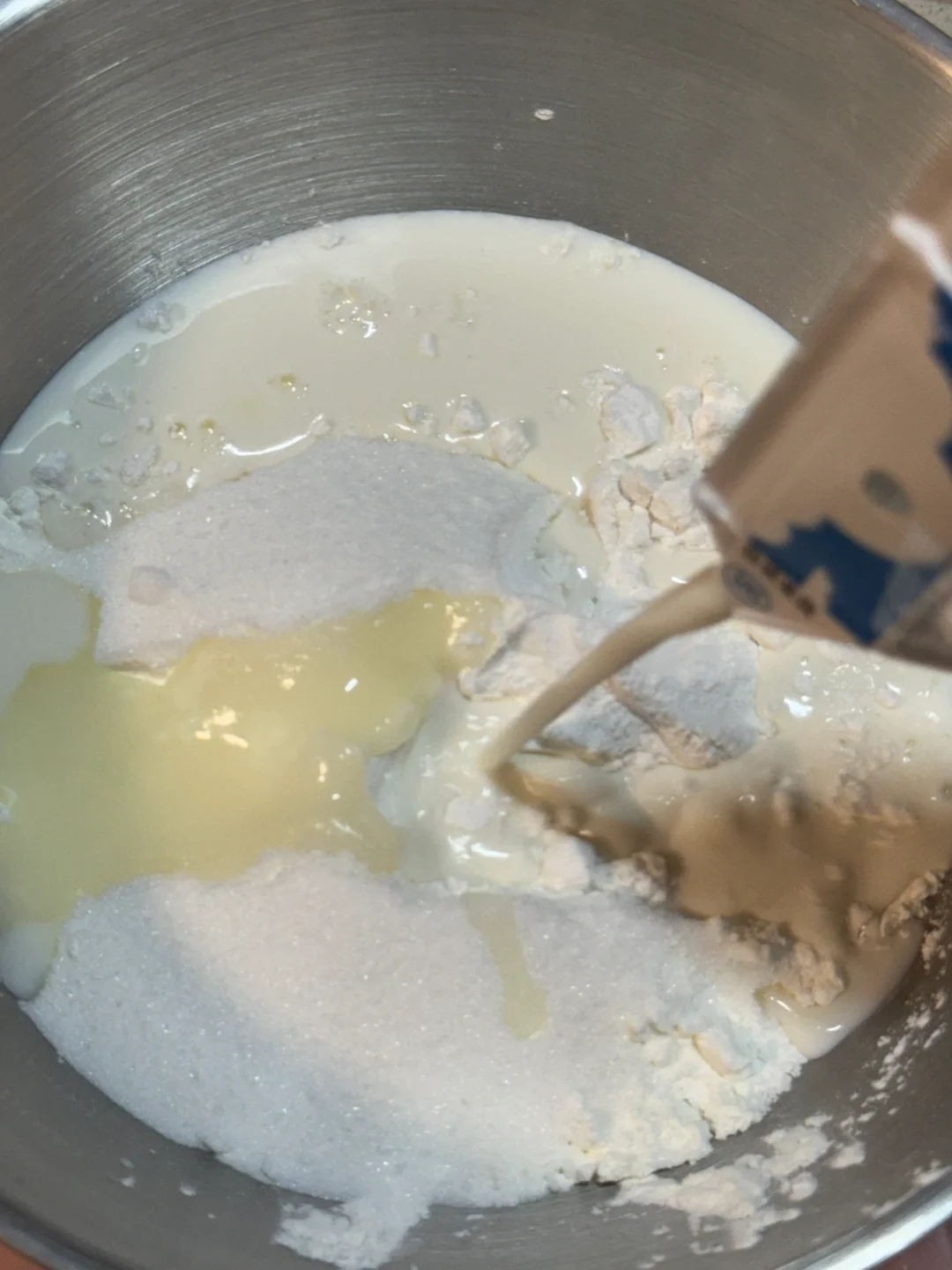 1.糯米粉、玉米淀粉、细砂糖,牛奶搅拌均匀