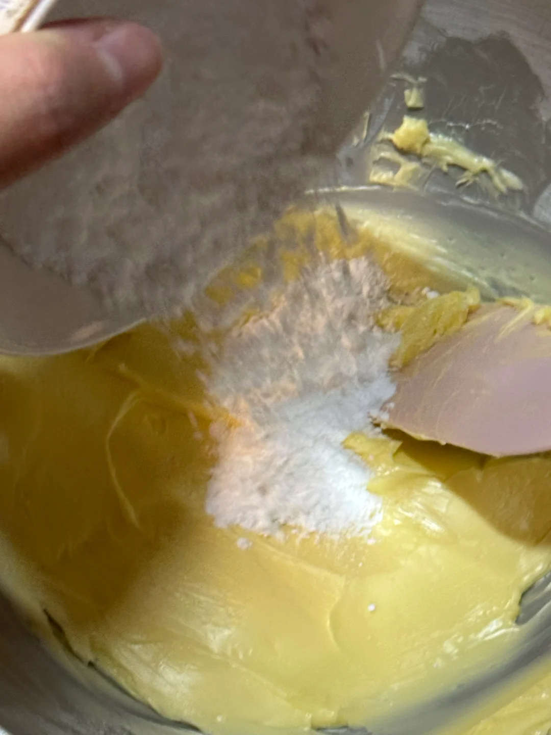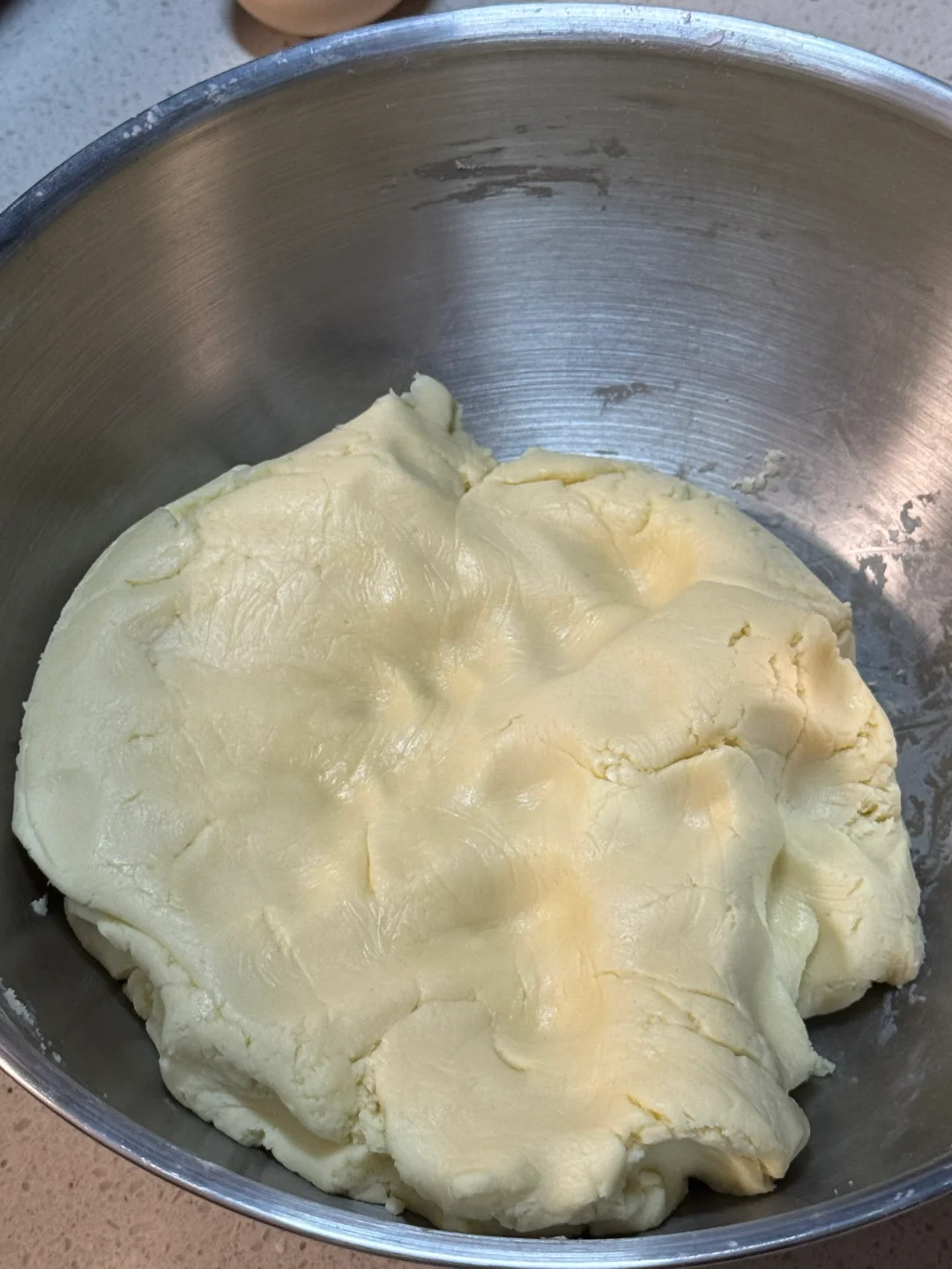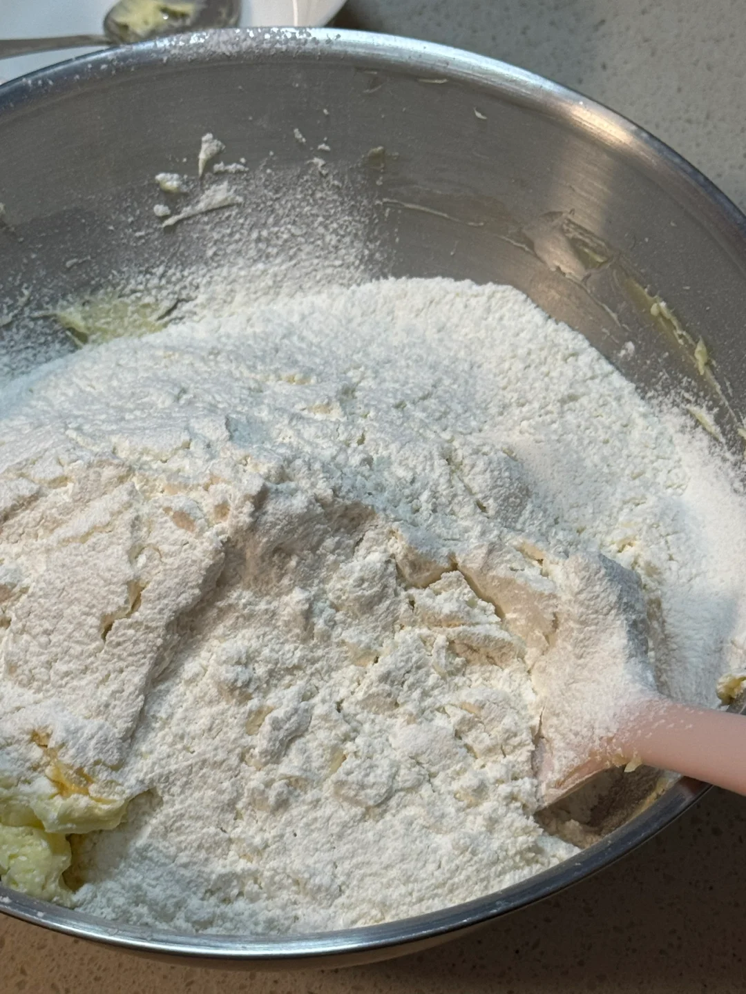 2.筛入低筋面粉、玉米淀粉切拌的手法,翻拌至无干粉,再下手揉成团(不要过度揉搓,防止起筋)