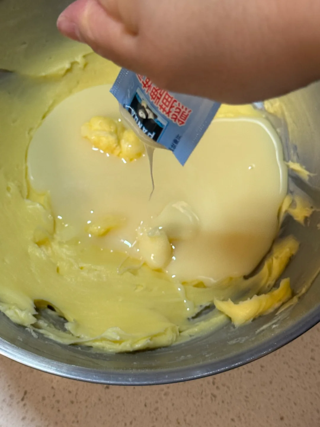 1.黄油室温软化后加入糖粉翻拌至顺滑,再加入炼乳,用打蛋器打发至蓬松发白。