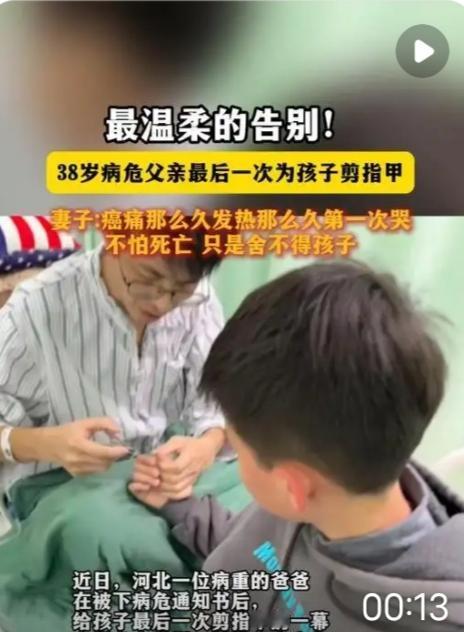 近日,河北一位病重的爸爸在被下病危通知书后,给孩子最后一次剪指甲的一幕令很多人落泪。 这是38岁的宋先生生命里最后的执念。11月3日下午,当那张薄薄却重如千斤的病危通知书递到家人手中,这个扛过两月癌痛、高烧不退都没掉过一滴泪的男人,在见到两个年幼孩子的瞬间,眼泪突然决堤。他用气若游丝的声音对妻子说:“把指甲刀给我,我再给孩子们剪一次。” 病房里弥漫着消毒水的味道,只剩下指甲剪轻微的“咔嗒”声。他瘦得只剩一把骨头的手不停颤抖,却每一下都小心翼翼,反复摩挲孩子的指尖,生怕剪到肉。“以后要听妈妈的话”“指甲长了要自己剪,别划着脸”,轻声的叮嘱里,藏着道不尽的牵挂。孩子们还不懂离别,只是乖乖依偎在床边,感受着爸爸冰凉却温柔的触碰,殊不知这是父亲用生命最后的力气,为他们拂去成长路上的微小障碍。 谁也没想到,这场几分钟的剪指甲,竟成了最后的告别。11月12日清晨,妻子轻声呼唤他,他说不出话,只眼角滑落泪水,在被问及“是不是舍不得孩子”时,用尽全身力气点了点头。几分钟后,这位父亲永远闭上了眼睛。 网友们看完视频集体破防:“他不怕死,只是舍不得没能陪孩子长大”“这才是父爱最深的模样,没有豪言壮语,只有拼尽全力的牵挂”。是啊,中国式父爱从来都藏在细节里,是生病时的守护,是犯错时的包容,更是生命尽头不愿缺席的最后一次照料。 这个故事狠狠戳中了每个人的软肋:我们总以为来日方长,却忘了生命无常。那些被我们忽略的日常,或许就是别人求而不得的珍惜。你和爸爸之间,有没有哪件平凡小事,至今想起仍心头一暖?欢迎在评论区分享你的故事,让爱被看见、被铭记。父亲弥留之际 病危瞬间