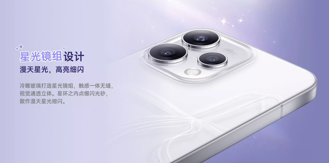 机身形态上,产品追求极致轻薄,星光蝴蝶结与学院蓝版本的厚度仅为7.77mm,极光蓝版本为7.89mm,整机重量约197g,搭配圆润流畅的机身线条,握持手感轻盈舒适,长时间使用无负担。此外,星光镜头组采用冷雕玻璃打造,与机身融为一体无缝设计,而且星环内还有闪光砂点缀,犹如漫天的星光在细闪。