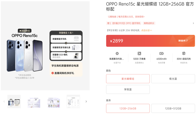 2025年12月19日,OPPOReno15c新品悄然登陆官方商城开售,以"星光蝴蝶结"为代表的潮流配色搭配高通第四代骁龙7移动平台、6500mAh超大电池与全焦段影像系统,为年轻用户带来性能与颜值兼备的旗舰体验。目前12GB+256GB版本预售价2899元,支持12期免息,购机即享多重限量好礼,学生用户更有专属权益加码。
