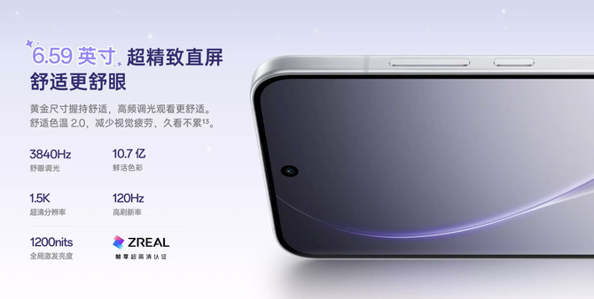 正面配备6.59英寸AMOLED柔性直面屏,1.5K超清分辨率,120Hz高刷新率,以及1200nits全局激发亮度。此外,具有的高频调光、舒适色温2.0,可以减少长时间观看屏幕时的视觉疲劳。