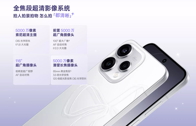作为本次新品的核心亮点,OPPOReno15c在影像配置上实现全面升级。后置搭载5000万像素广角主摄+800万像素超广角镜头+5000万像素长焦镜头的全焦段三摄组合,其中广角与长焦主摄均支持两轴OIS光学防抖,最高可实现3.5倍光学变焦与120倍数码变焦。前置5000万像素AF自动对焦摄像头,搭配美颜自拍、屏幕补光等功能,轻松拍出自然通透的自拍大片,AI证件照、萌拍等实用模式进一步丰富创作场景。视频拍摄方面,前后置均支持4K60fps防抖录制、HDR视频及电影模式,慢动作拍摄最高可达240fps,满足用户多样化视频创作需求。