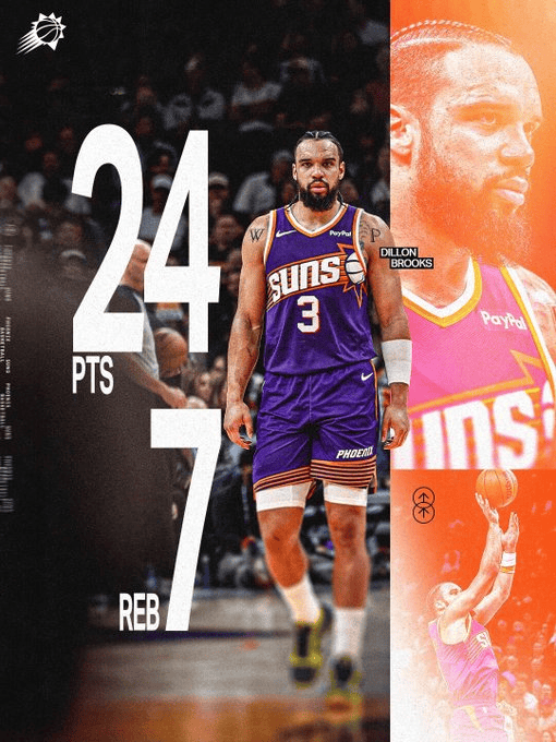 赛后,太阳官方发布狄龙数据海报,并配文道:“狄龙本赛季第11次得分20+。请投票助他进入全明星。”