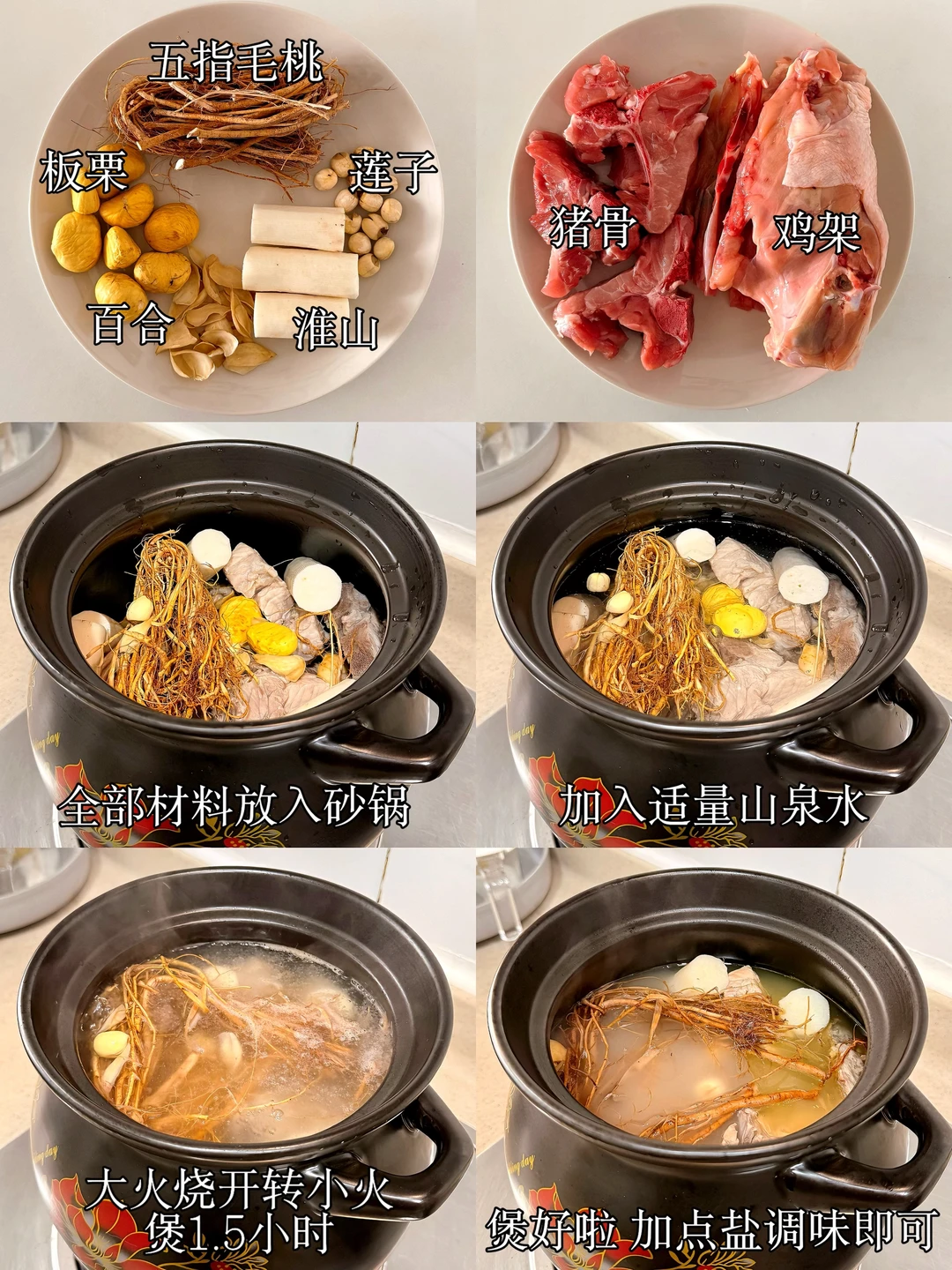 近排甲流“横行霸道”好多人都🀄️招了 大家出门戴口罩😷注意饮食[扯脸H]注意身体~ 今天煲个清润养脾肺的汤,板栗搭配五指毛桃淮山 健脾祛湿,清心润肺,滋补又不上火 脾🫁弱的小朋友,建议一周安排1~2次 板栗粉糯香甜,清甜可口,淡淡的椰香 大人小孩都适🈴喝,喝一碗由头润到jio趾尾[偷笑R] - 🍲食材: 板栗、淮山、五指毛桃、百合、莲子、猪骨、鸡架 - [清单R]做法:具体做法请参考图[六R] - 脾虚,湿气重的,快码住这个神仙搭配! 多喝汤,脾胃好,身体吸收好!吃麻麻香[赞R]