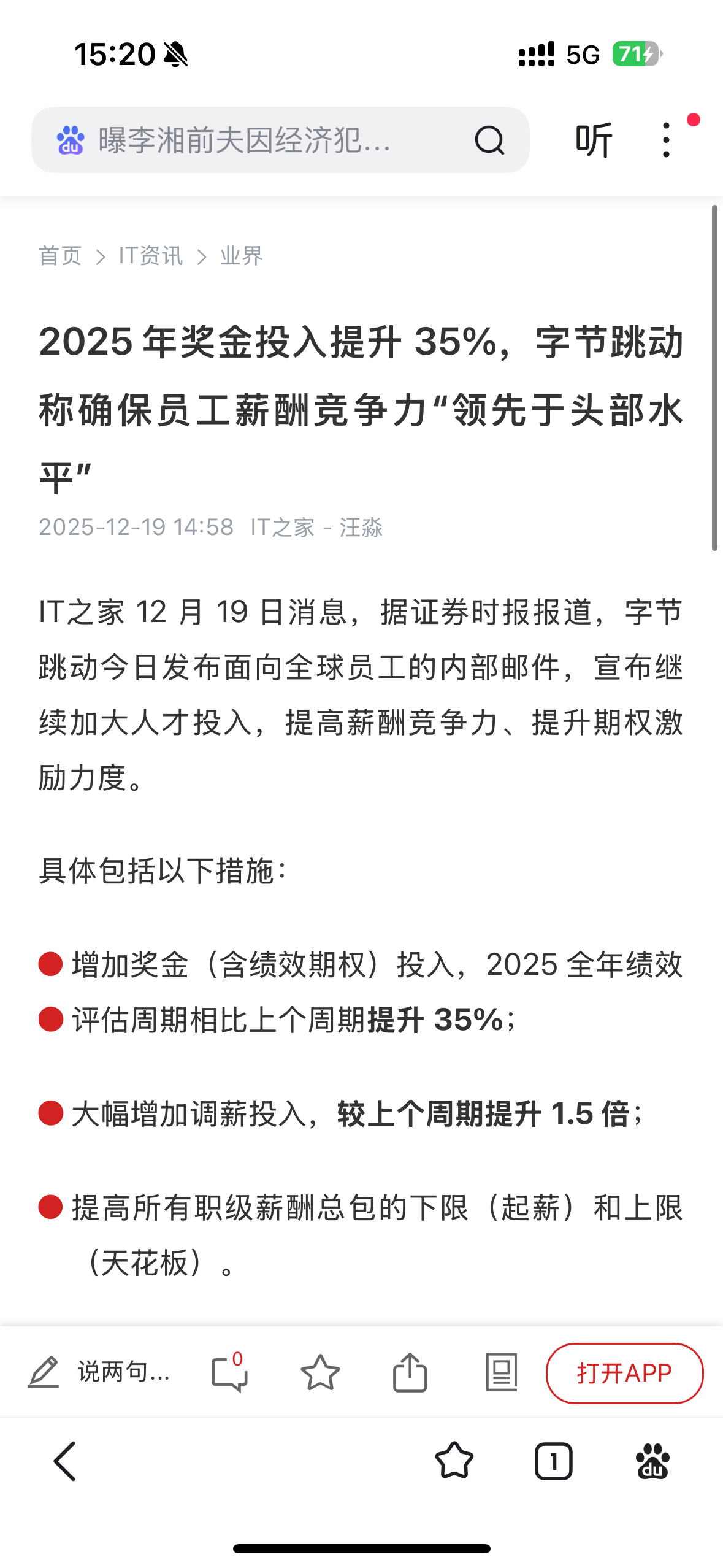 【】12月19日,字节跳动发布面向全球员工的内部邮件,宣布继续加大人才投入,提高薪酬竞争力、提升绩效激励力度。具体包括四大措施:增加奖金(含绩效期权)投入,2025全年绩效评估周期相比上个周期提高35%;大幅增加调薪投入,较上个周期上涨1.5倍;提高所有职级薪酬总包的下限(起薪)和上限(天花板)。