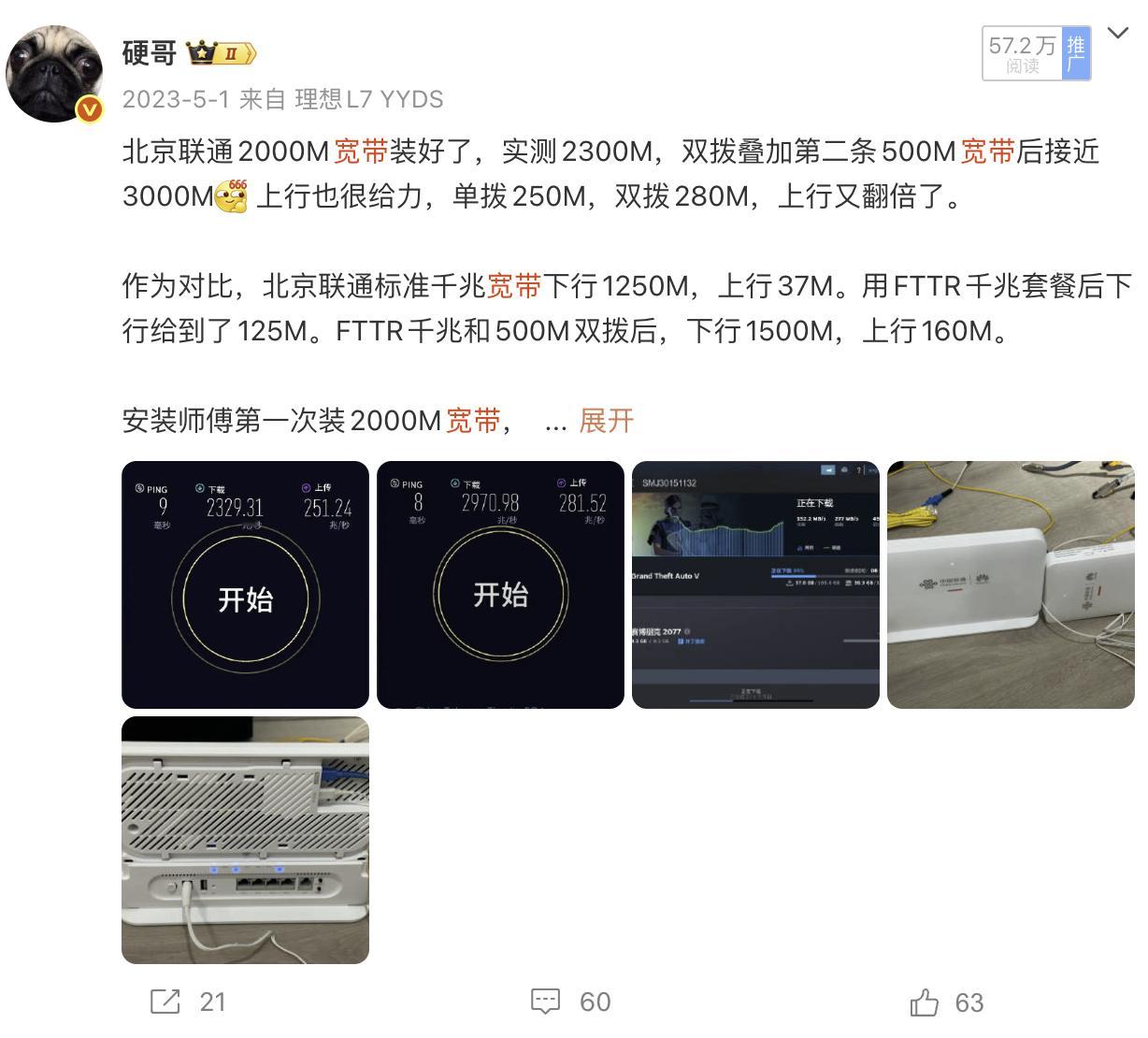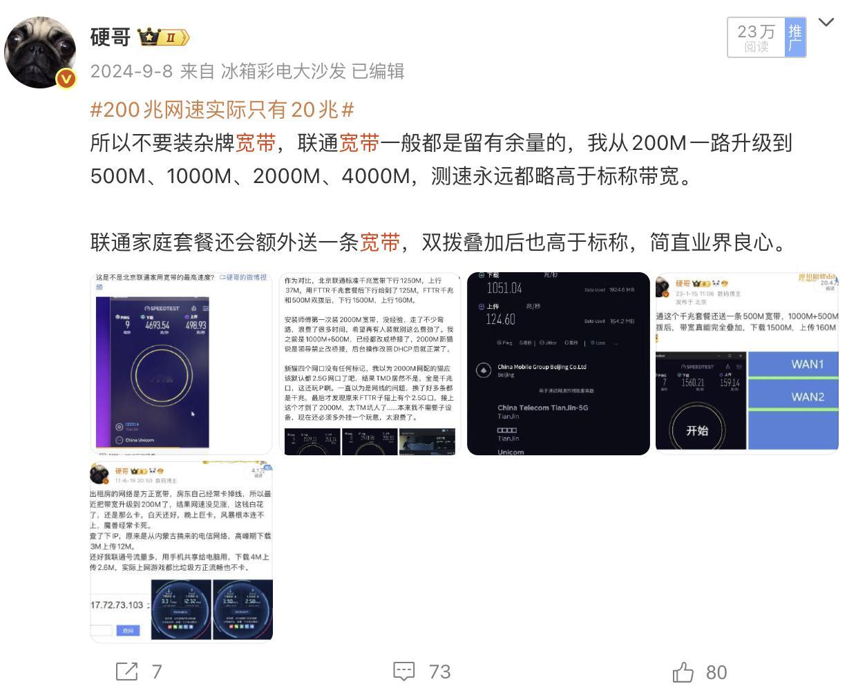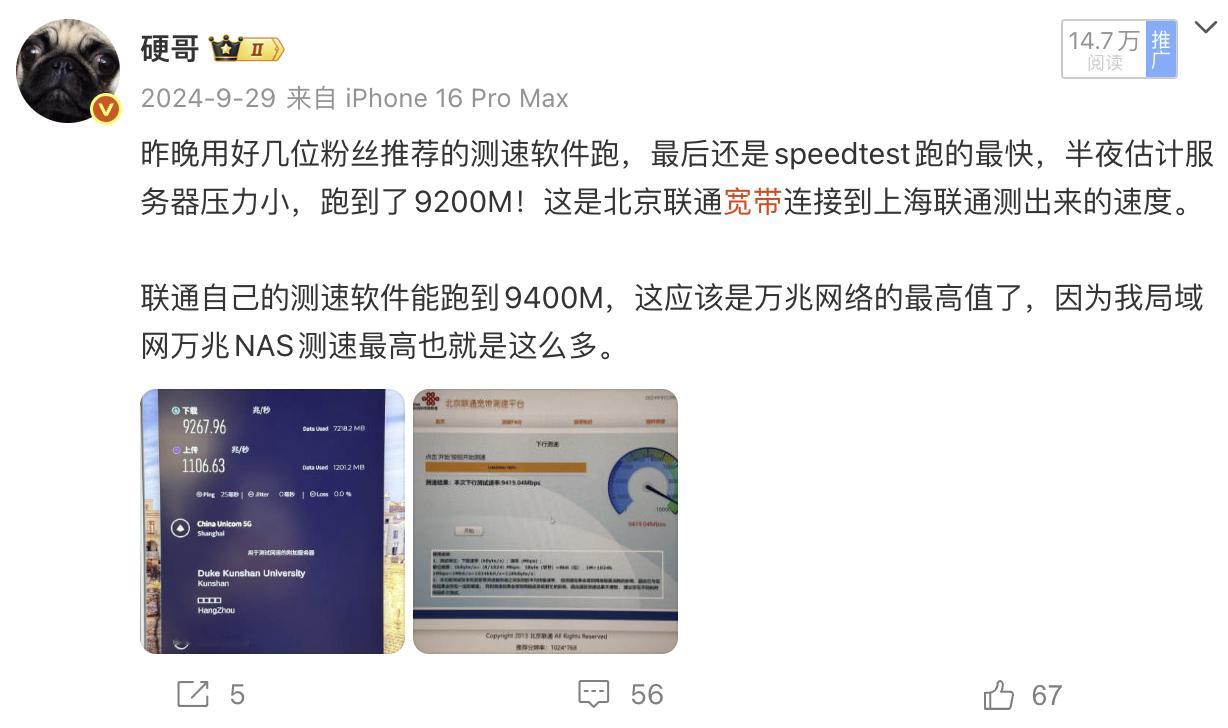 罗永浩痛批电信宽带缩水 联通宽带不仅不缩水,还会额外给,这些年我每次升级北京联通宽带时都会实测,结果如下,全都有微博和截图为证:1000M实测1250M;1500M实测1560M(双拨);2000M实测2300M;2500M实测3000M(双拨);4000M实测4700M(双拨);10000M实测9400M,这个没达到就是网线物理带宽的限制了,局域网万兆NAS也跑不到万兆的。之前的测速都是2.5G网线接1000M/2000M宽带,物理带宽是有余量的。