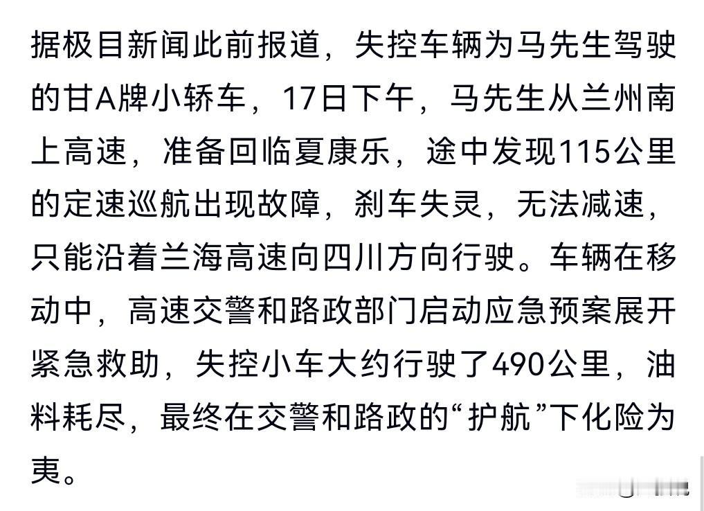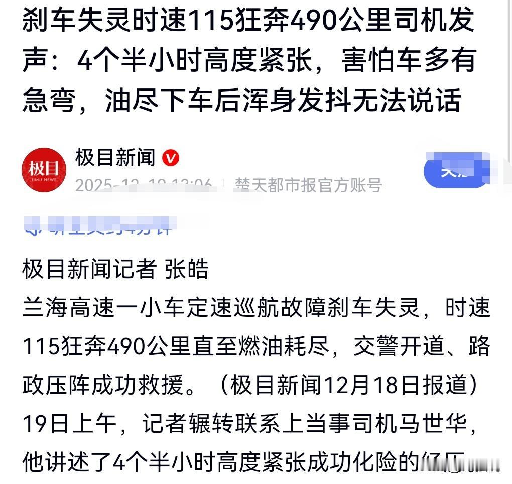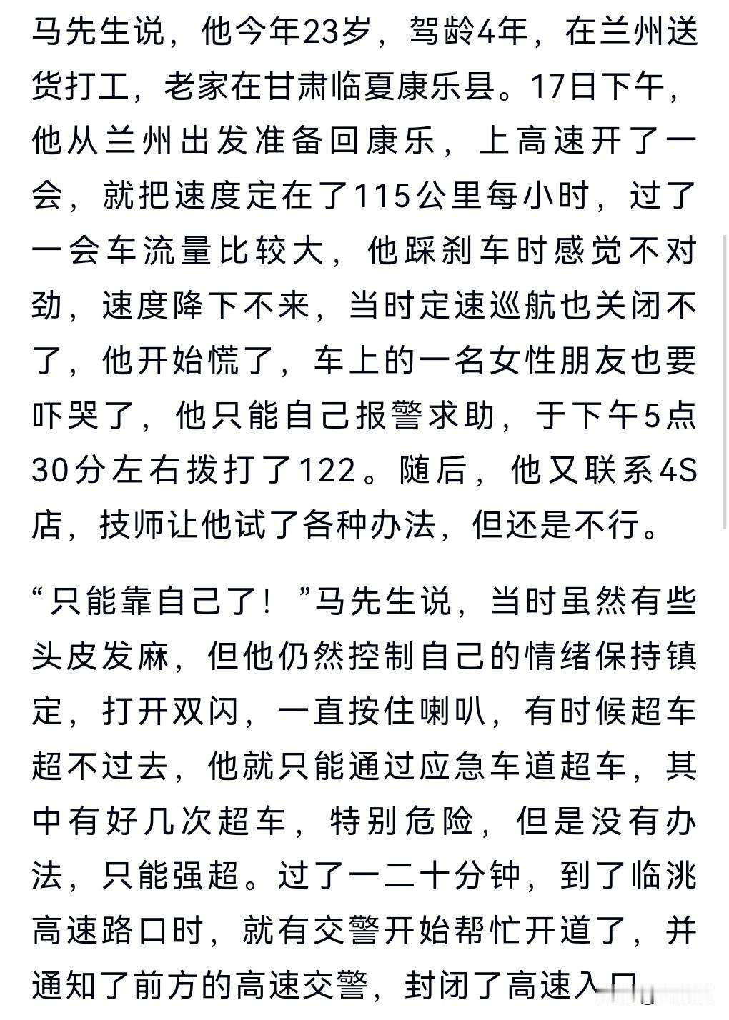 这真是太吓人了,这真是高速惊魂啊。 12月17日晚,兰海高速,一小车刹车失灵狂奔490公里。 幸亏在交警的护送下,最终化险为夷,慢慢的将油耗尽了,终于停下来了。 下来司机身体都发抖,说不了话了。 高速行驶时,当时车上还有一名女子,也是被吓得哭了。 刹当时他还搞了个巡航定速115千米每小时,后来刹车失灵,一直在这个速度下,那真的是太可怕了。 现在男子想退车或者是换车。 那必须换或者退呀,这么不靠谱的车。