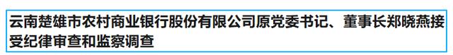 据省纪委监委驻省农信社纪检监察组、红河州监委消息:云南楚雄市农村商业银行股份有限公司原党委书记、董事长郑晓燕涉嫌严重违纪违法,目前正接受省纪委监委驻省农信社纪检监察组纪律审查;经云南省监委指定红河州监委管辖,红河州监委指定弥勒市监委管辖,正接受弥勒市监委监察调查。
