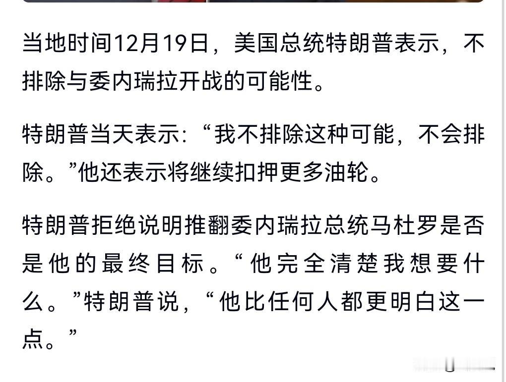 不好了,不好了。 当地时间12月19日。 美国的强盗本性又露出来了。 特朗普称不排除与委内瑞拉开战,并且还会扣押更多委内瑞拉的油轮。 这真是太丧心病狂了。 已经开始明抢了。 特朗普政府实在是太邪恶了,世界无安宁。