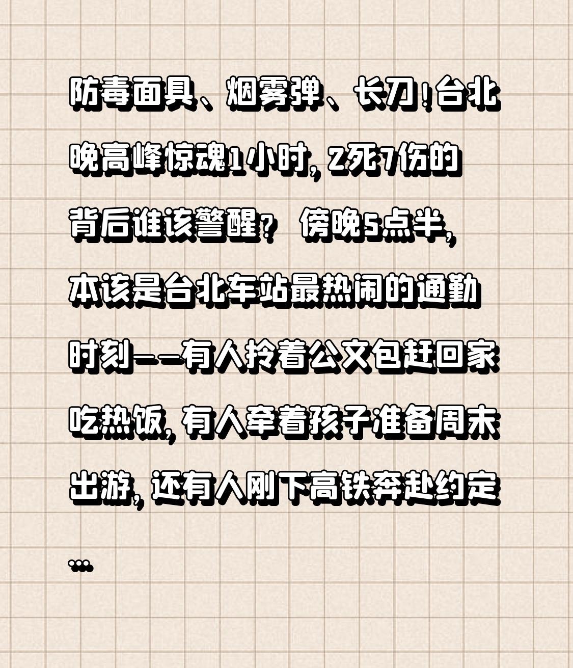 防毒面具、烟雾弹、长刀!台北晚高峰惊魂1小时,2死7伤的背后谁该警醒? 傍晚5点半,本该是台北车站最热闹的通勤时刻——有人拎着公文包赶回家吃热饭,有人牵着孩子准备周末出游,还有人刚下高铁奔赴约定的团圆。可谁也没想到,一声巨响突然划破喧嚣,刺鼻的浓烟瞬间吞没了人流密集的出口,一场预谋已久的袭击,让这座城市的晚高峰变成了惊魂现场。 监控画面里,一名头戴防毒面具的男子格外刺眼,他一手拎着烟雾弹,一手握着长刀,在人群中毫无征兆地发动攻击。“味道呛得睁不开眼,只能跟着人群疯跑”,幸存者的声音还在颤抖,混乱中有人摔倒,有人被刀刃划伤,还有人因为吸入过多浓烟当场失去意识。更让人揪心的是,嫌犯并未停手,而是一路逃窜至捷运中山站,沿途继续投掷烟雾弹、追砍路人,短短1小时内,9名无辜民众倒下,其中2人不幸离世,3人仍在ICU抢救,生死未卜。 就在大家猜测这是随机施暴时,反转接踵而至:警方通报嫌犯名为张文,27岁,竟是一名被通缉的逃兵,身上还携带了汽油瓶和疑似防弹衣,显然是早有预谋。更让人脊背发凉的是,这并非台北车站首次暴露安全漏洞——两个月前这里刚发生过公然性侵案件,而此次嫌犯携带烟雾弹、长刀等危险品如入无人之境,让网友愤怒质问:“安检到底形同虚设到什么程度?” 案发后,嫌犯在百货公司被警方包围,最终从6楼坠楼身亡,可逝去的生命再也无法重来。57岁的余先生只是下班路过,却再也没能回到家人身边;那些在ICU里挣扎的伤者,背后是一个个等待的家庭。有网友说得戳心:“我们日复一日通勤,求的不过是平安到家,可公共安全的底线,怎么就一次次被突破?” 十年前的北捷郑捷案警钟犹在耳畔,如今悲剧重演,2死7伤的数字背后,是城市安全网的缺位。公共空间的安保不是一句空话,危险品排查、重点区域巡逻、预警机制完善,每一个环节都容不得半点敷衍。毕竟,对普通人来说,最珍贵的从来不是远方的风景,而是每次出门都能平安归来的踏实。 愿逝者安息,伤者早日康复。更希望这次的悲剧能真正敲响警钟,让每一座城市的公共空间都能筑牢安全防线,让“平安”不再成为奢侈品。你怎么看待公共场合的安保问题?欢迎在评论区留下你的观点。
