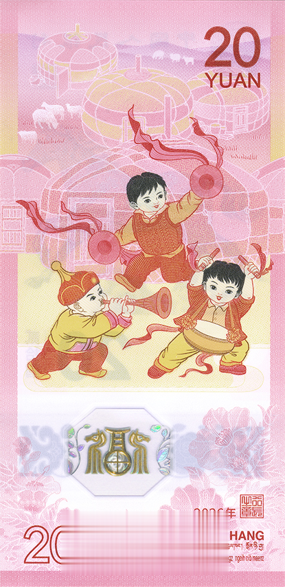 纪念钞背面主景为儿童欢庆锣鼓图案,辅以蒙古包装饰图案,上方为面额数字“20”、汉语拼音字母“YUAN”,下方为花卉与动感全息图案、年号“2026年”、行长章、面额数字“20”、“中国人民银行”汉语拼音和蒙、藏、维、壮四种民族文字的“中国人民银行贰拾圆”字样。
