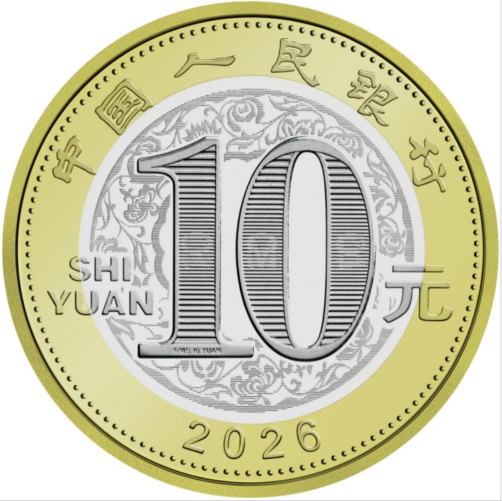 双色铜合金纪念币正面图案为“中国人民银行”、“10元”字样,汉语拼音字母“SHIYUAN”及年号“2026”,底纹衬以团花图案。