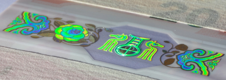 位于票面下方。票面背面可见“八方花窗”内“福”字装饰纹样呈现金色效果。防伪特征效果见图7。