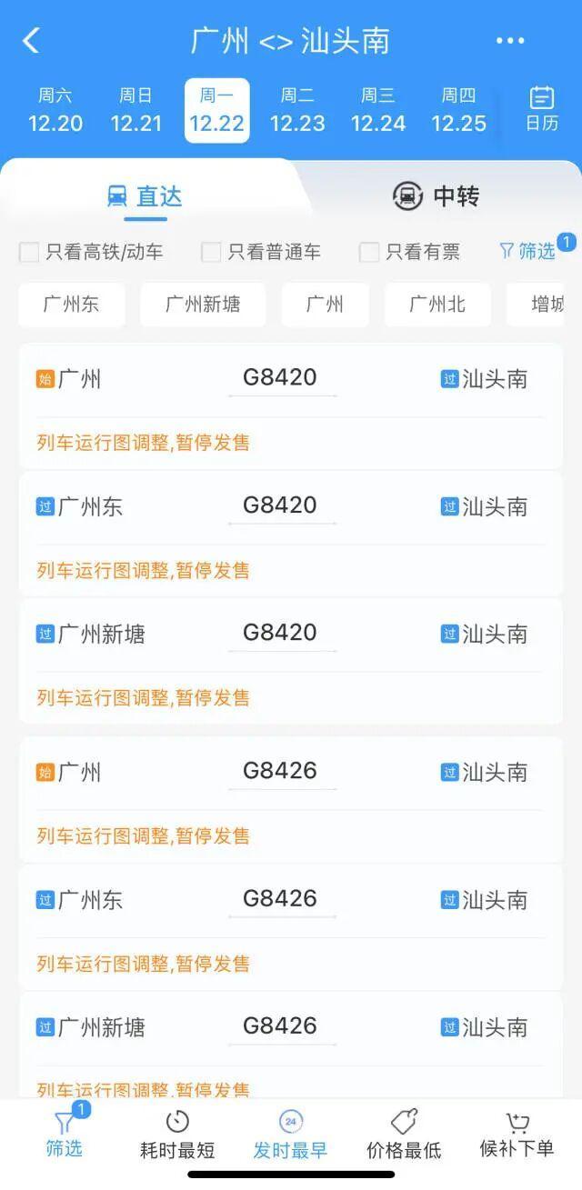 目前,12月22日到汕头南站高铁运营班次已全部录入12306售票系统,票价和具体运行时间尚未公布,从广州出发的话,广州站、广州东站、广州新塘站均有班次,十分便利。