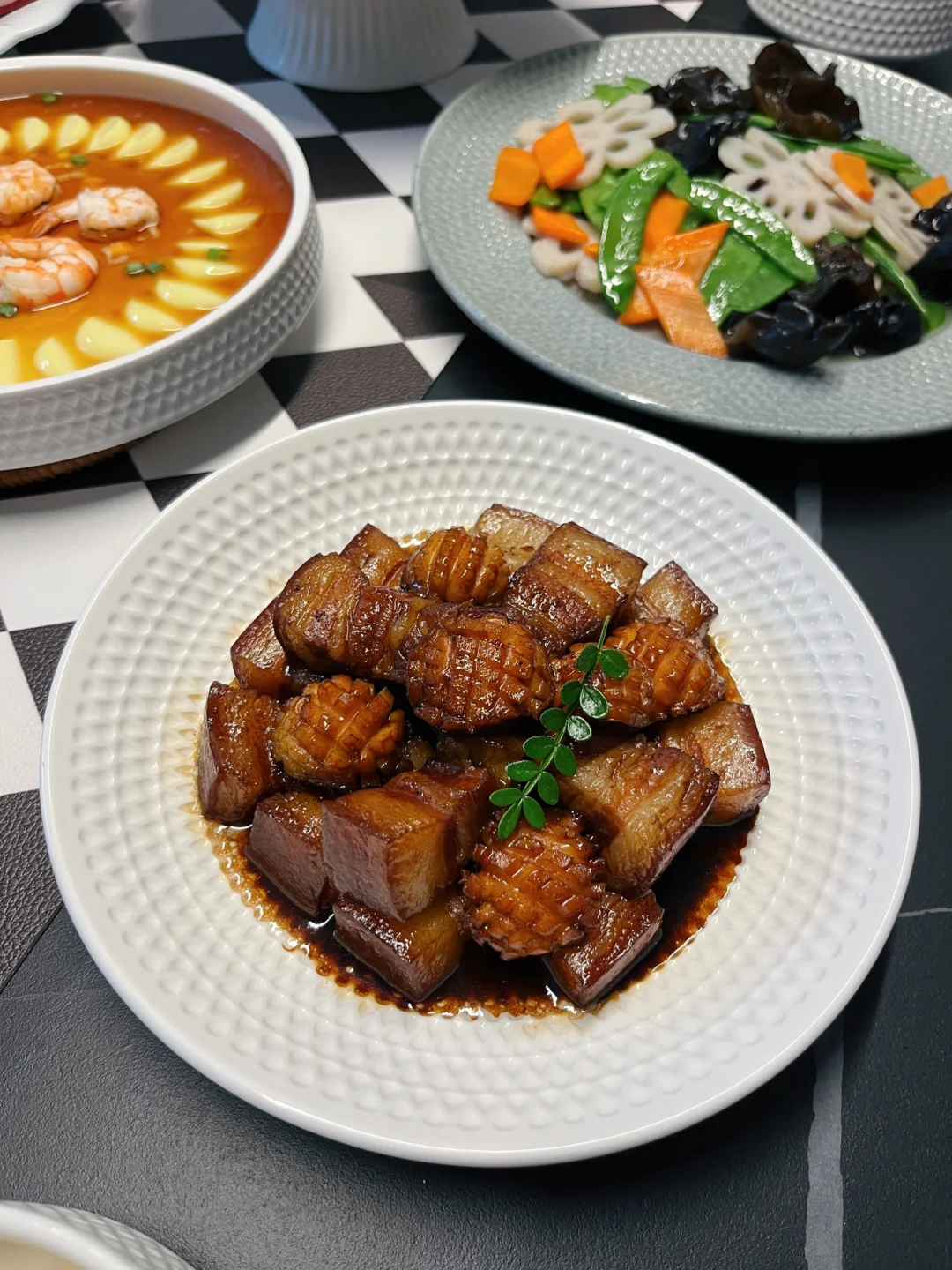 【鲍鱼红烧肉】:1️⃣五花肉切块,鲍鱼清洗干净2️⃣五花肉冷水下锅,加入料酒、葱、姜大火烧开撇去血沫,捞出控干。3️⃣锅内热油下冰糖至融化,放入五花肉炒至琥珀色。4️⃣加入料酒,生抽,红烧酱油葱,