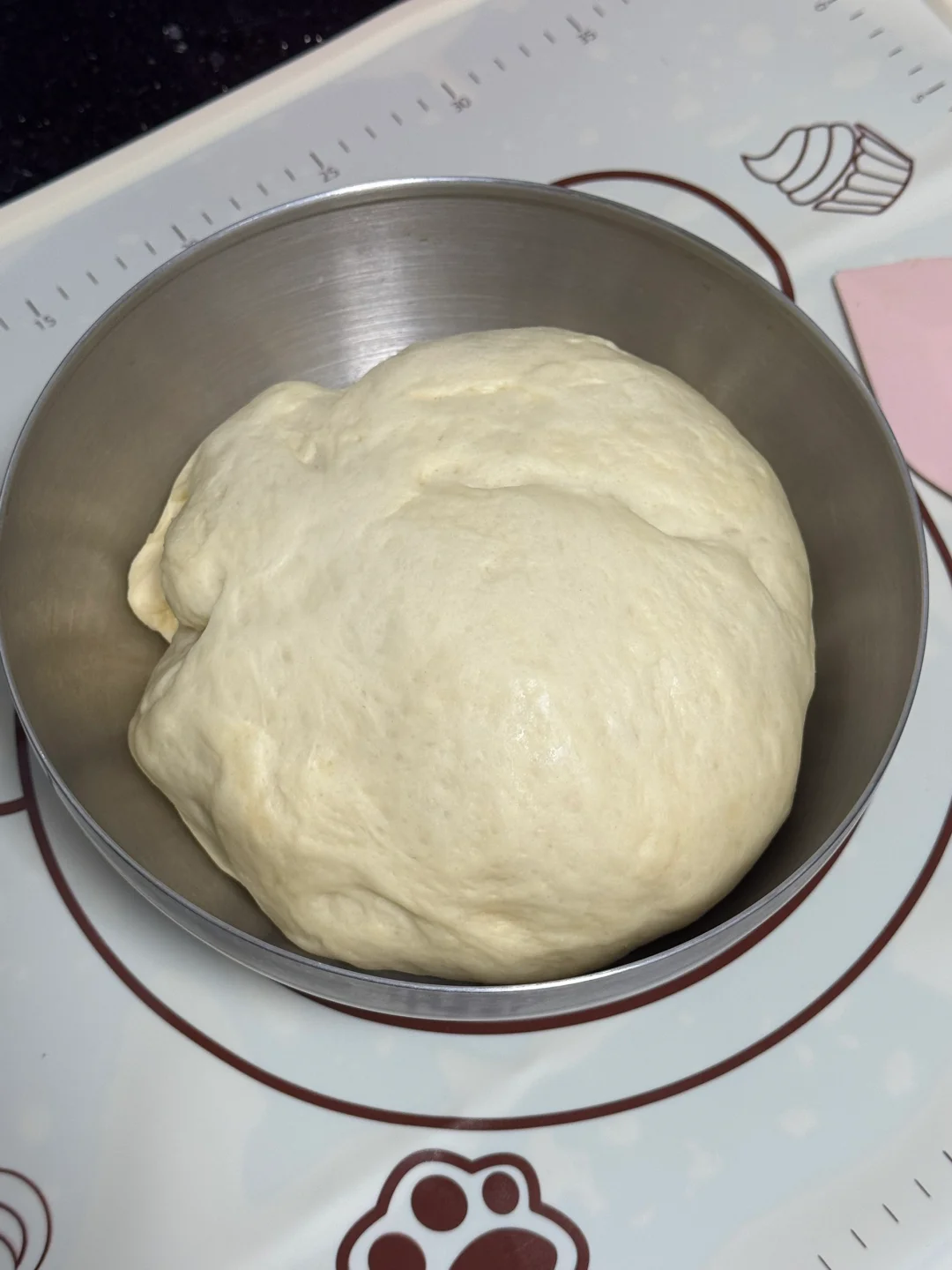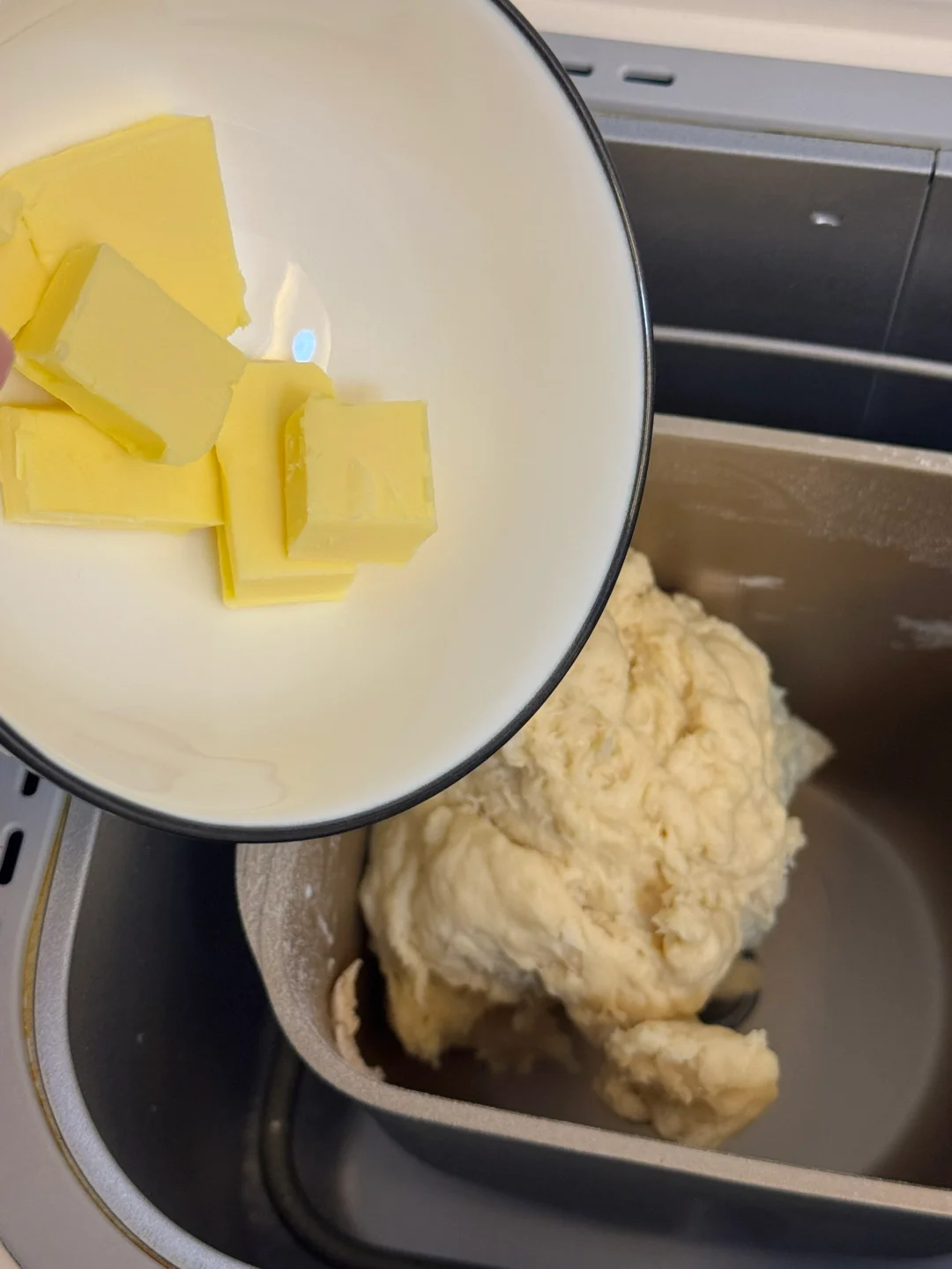 1.除黄油、盐,其他食材全部放面包机中,开启揉面模式进行揉面,揉至大至均匀放入黄油、盐再进行揉面,揉出手套膜即可拿出,面团整理光滑,烤箱进行一次醒发28度1小时。