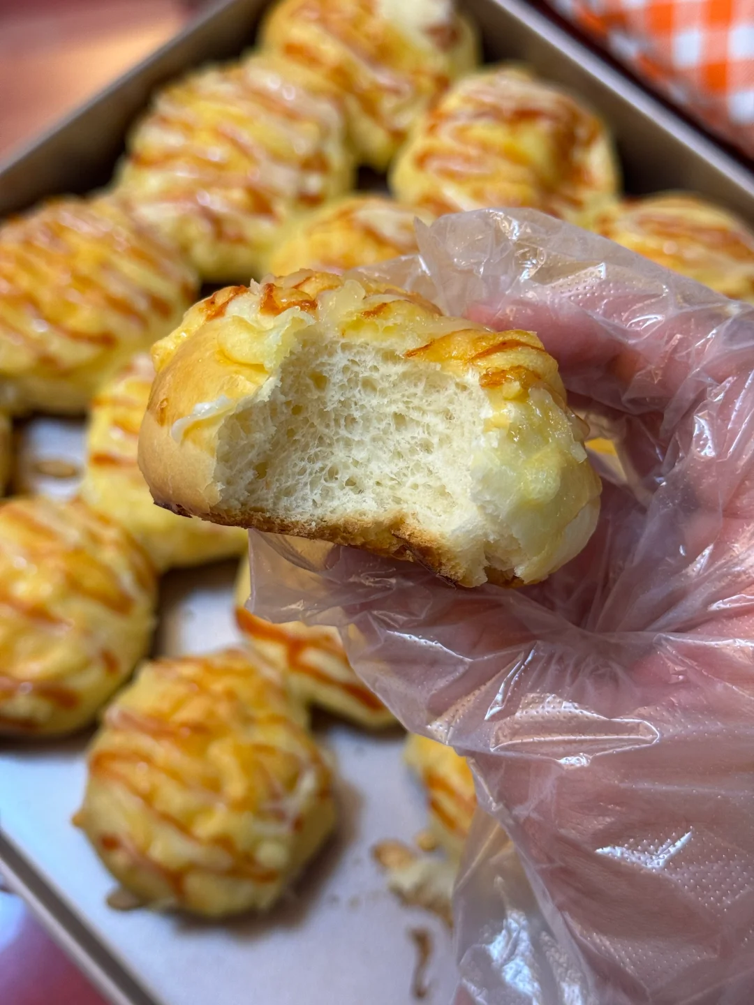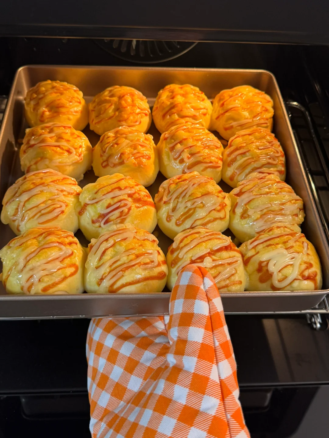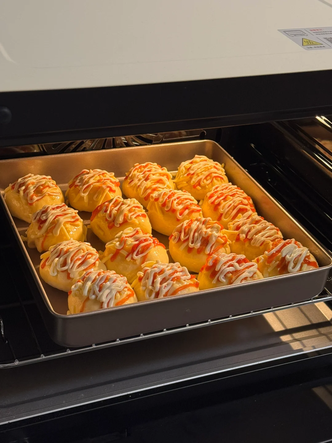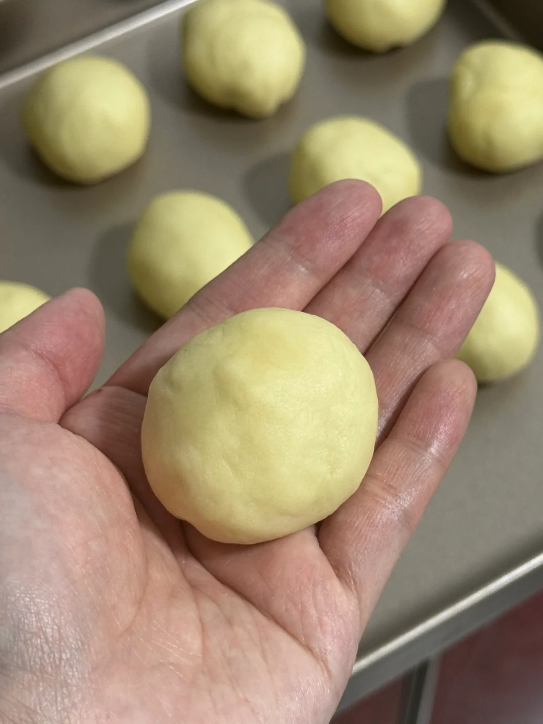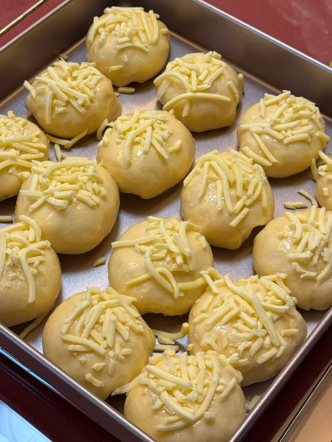 2.发酵好的面团均分成16份,滚圆,再松弛20分钟,放入烤盘,烤箱进行二次醒发35度40分钟。