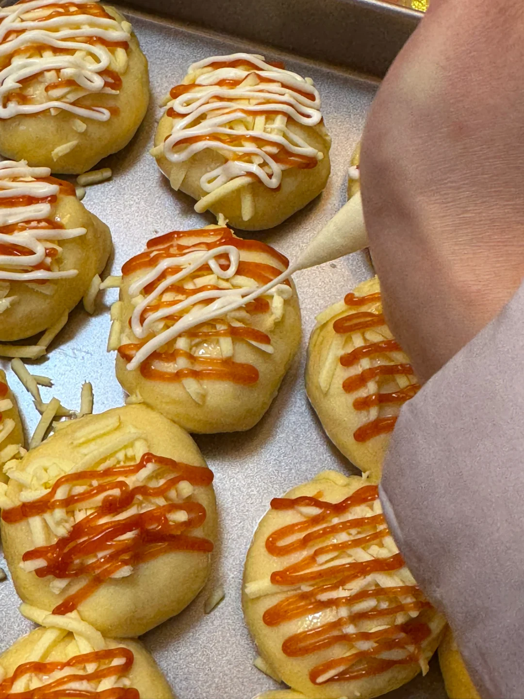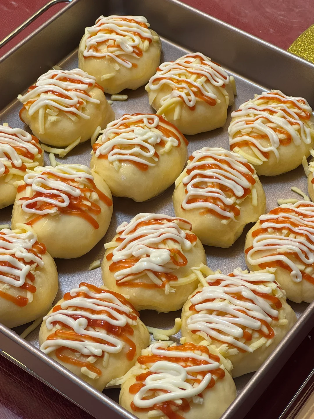3.醒好的面团,撒上一芝士碎,挤上番茄酱、沙拉酱,烤箱提前预热,160度烘烤25分钟。